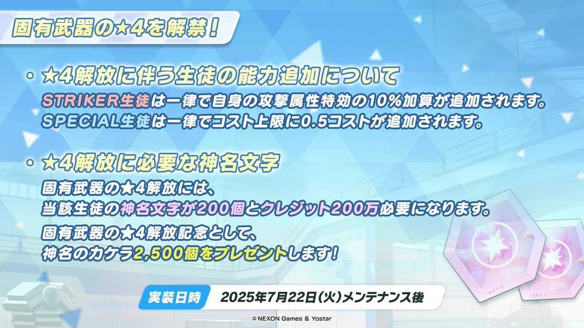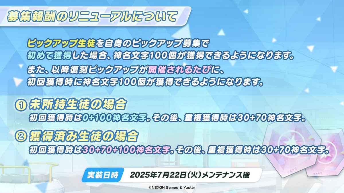 7月22日(火)メンテナンス後より、ピックアップ生徒さんをピックアップ募集で初めて獲得した場合、神名文字を追加で100個獲得できるようになります!
