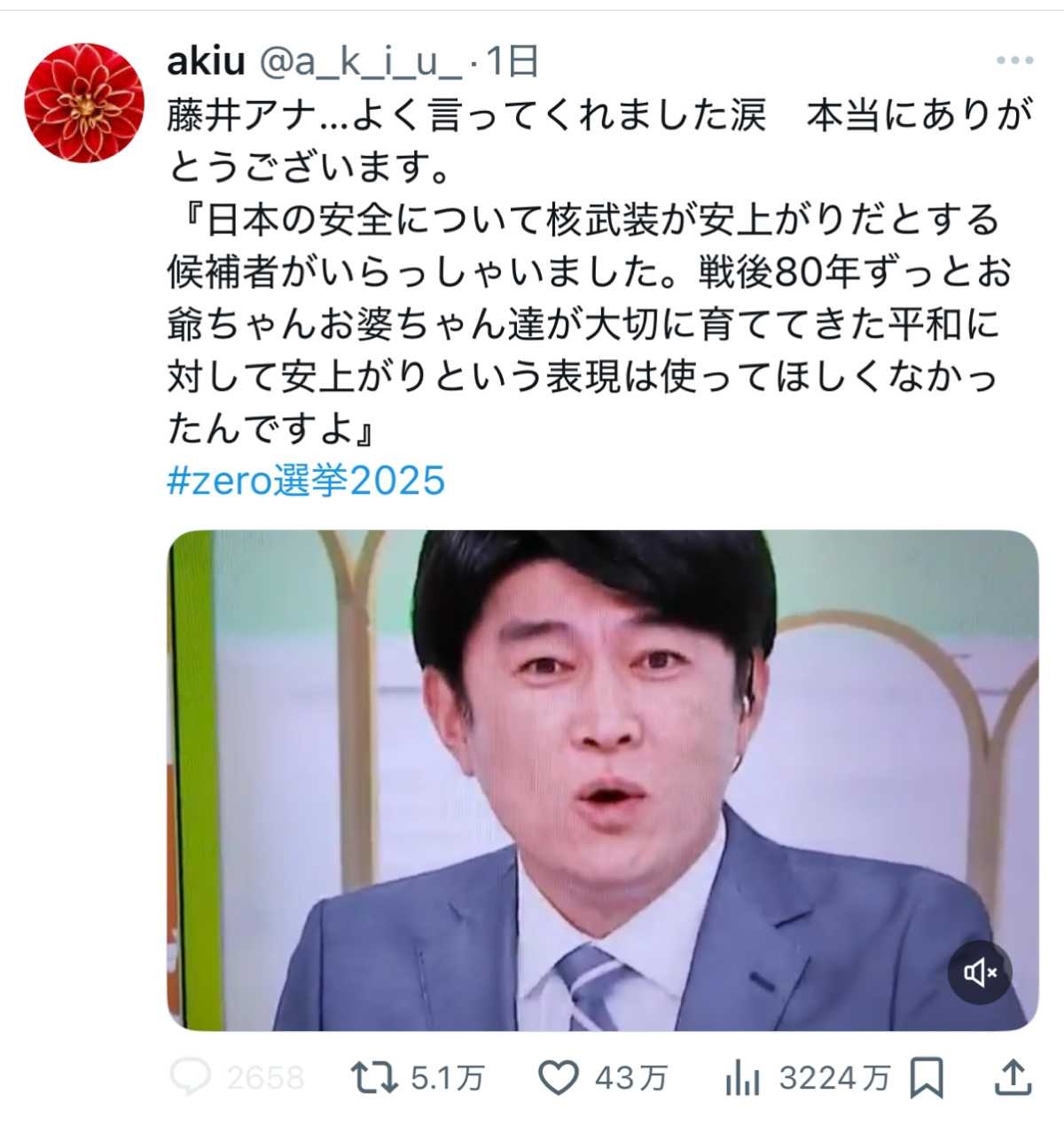 別に国民から選ばれた議員という訳でもないいちアナウンサーごときが公共の電波で個人的意見を発信するな