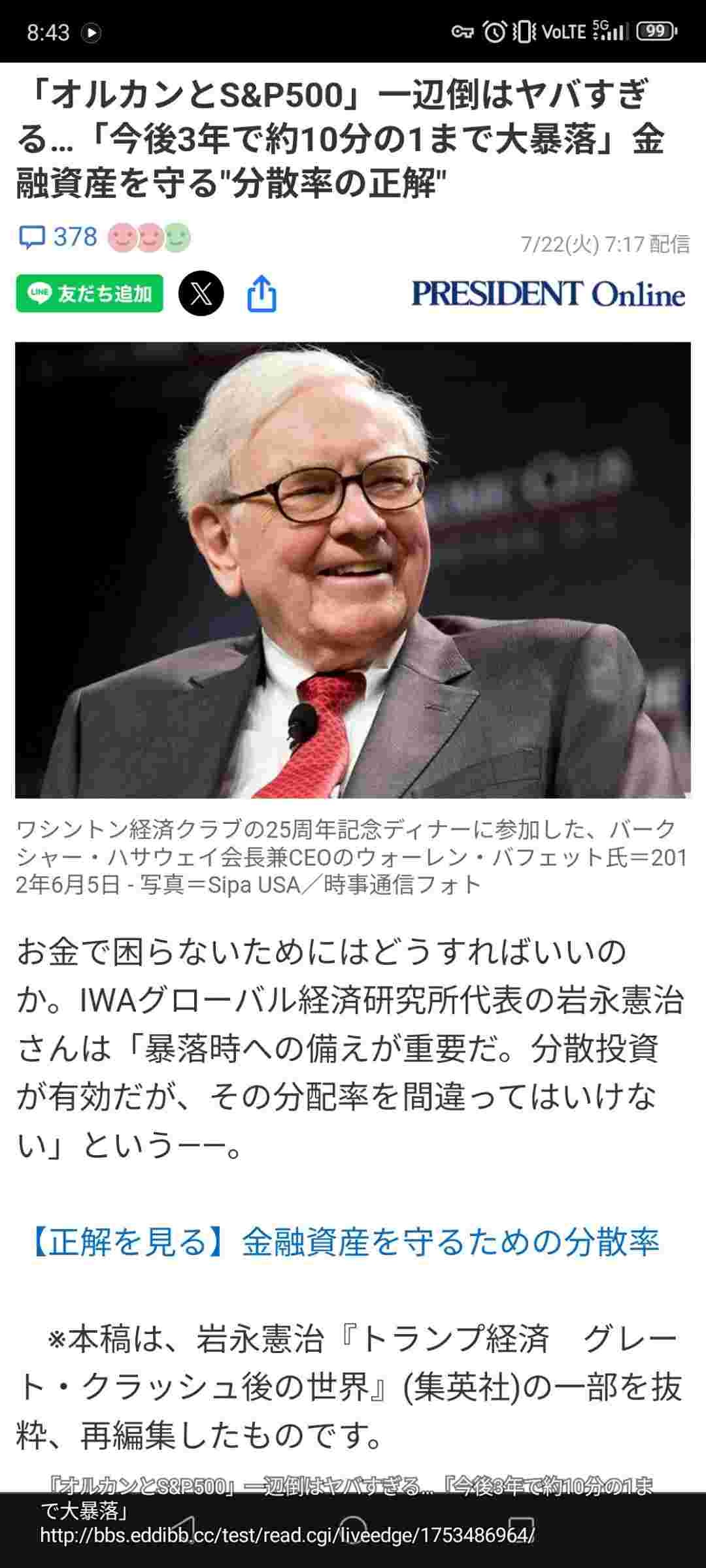 バフェットが資産の殆どを現金に変えてるのは事実だろ