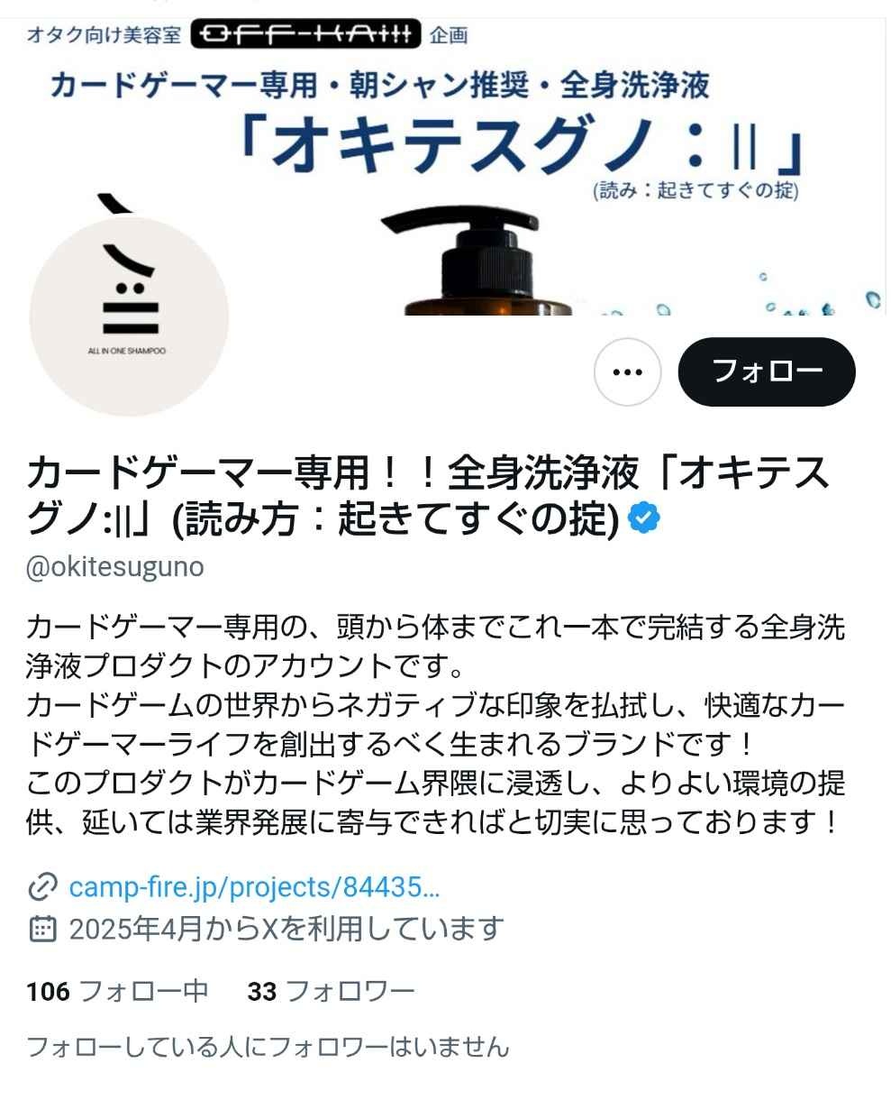 「臭すぎカードゲーマー用のシャンプーを開発しました!みんな使って!」←33フォロワーで終了