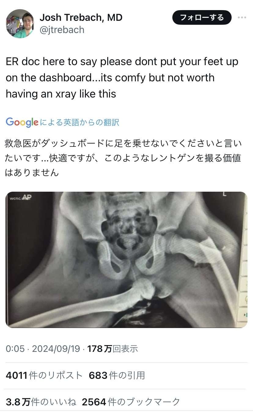 【画像】医者「車のダッシュボードに足乗せないでね。事故ったらこうなるよ」→4万いいね [834922174]