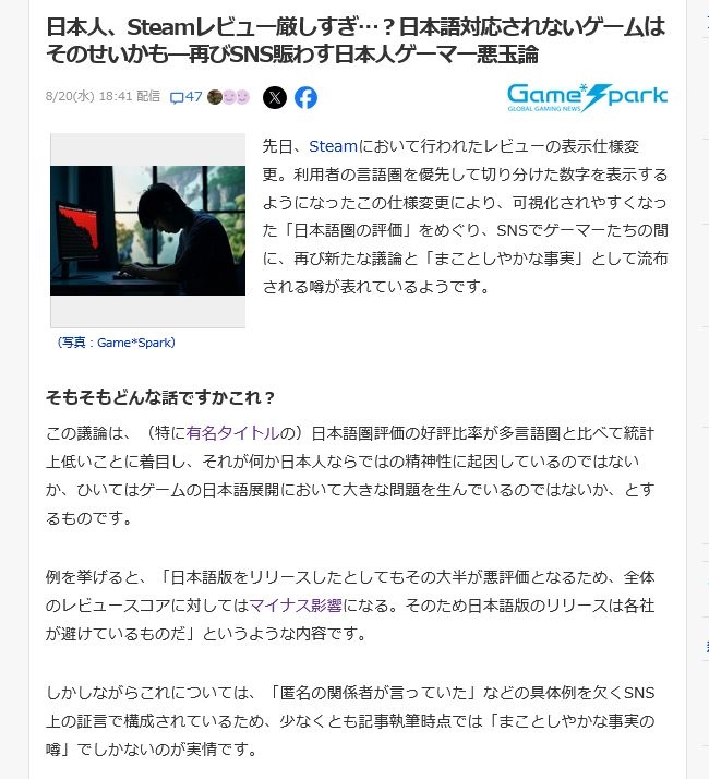 常にインディーゲー漁っとるほどのコアゲーマーは日本人でもXとかでポジティブな発言しとるやつが多い