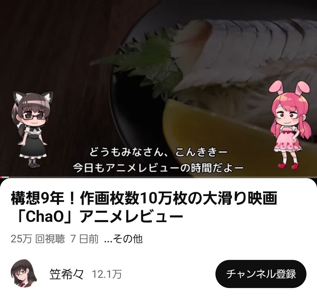 登録者10万越えの大手アニメレビュアー笠希々がそれまで無名だったChaOを取り上げた動画を出した