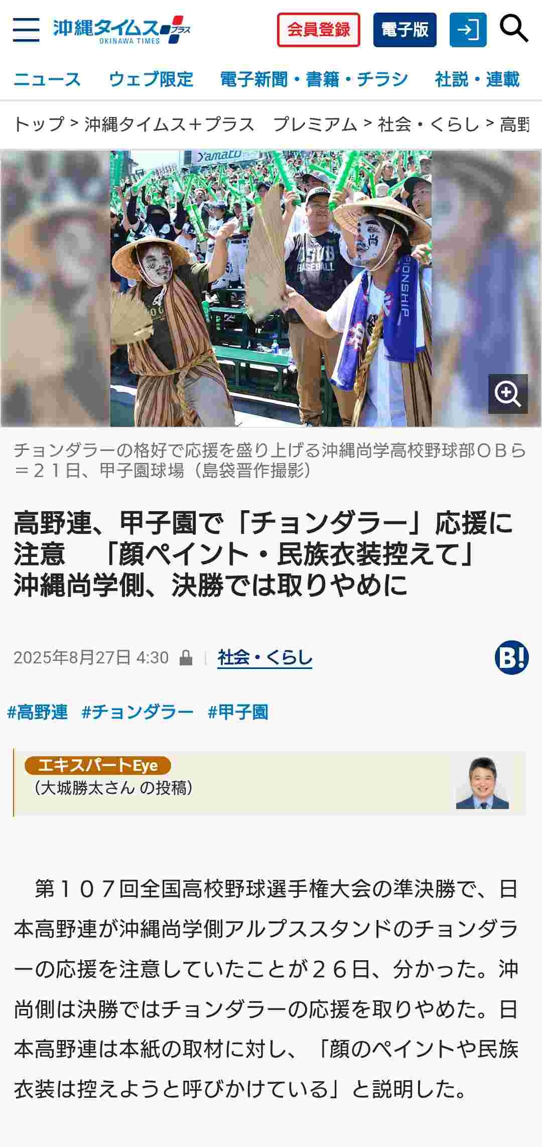 第107回全国高校野球選手権大会の準決勝で、日本高野連が沖縄尚学側アルプススタンドのチョンダラーの応援を注意していたことが26日、分かった。沖尚側は決勝ではチョンダラーの応援を取りやめた。日本高野連は本紙の取材に対し、「顔のペイントや民族衣装は控えようと呼びかけている」と説明した。