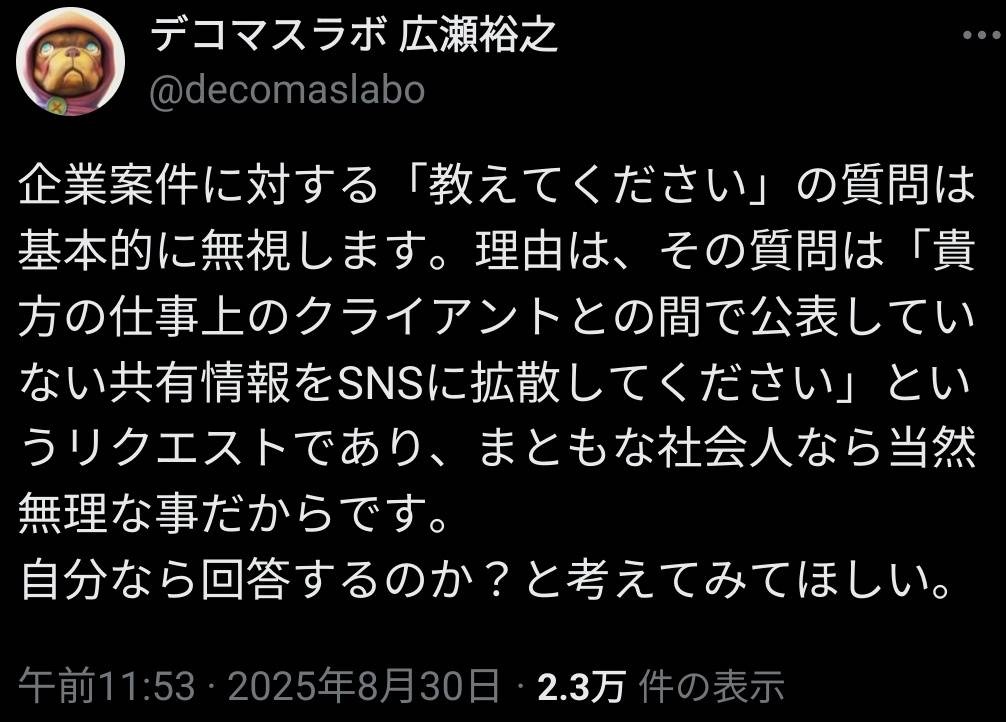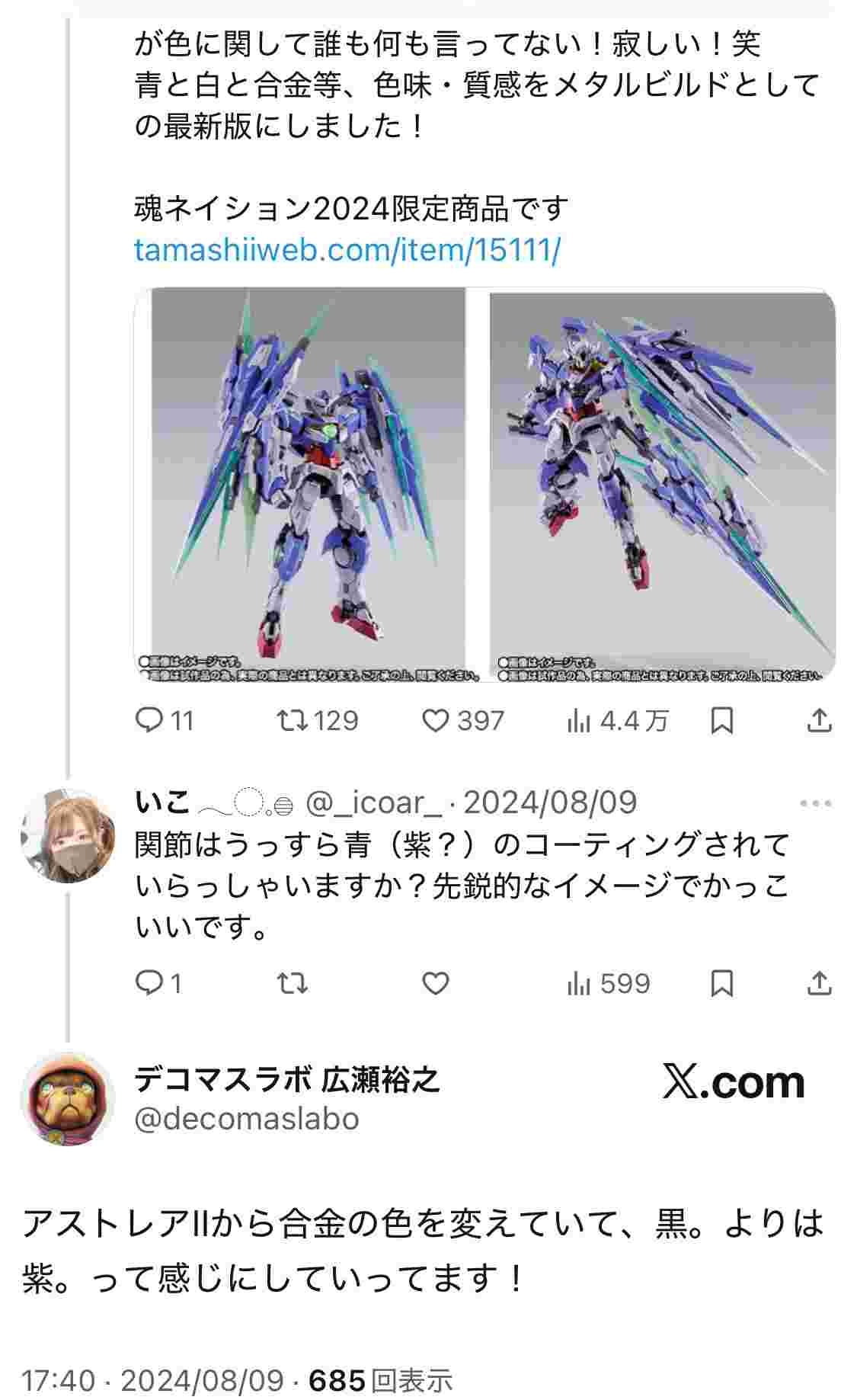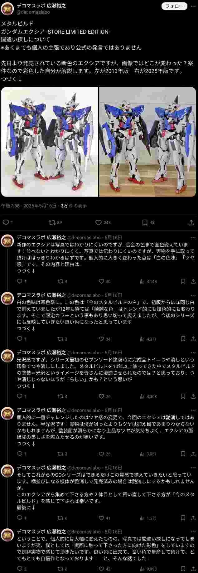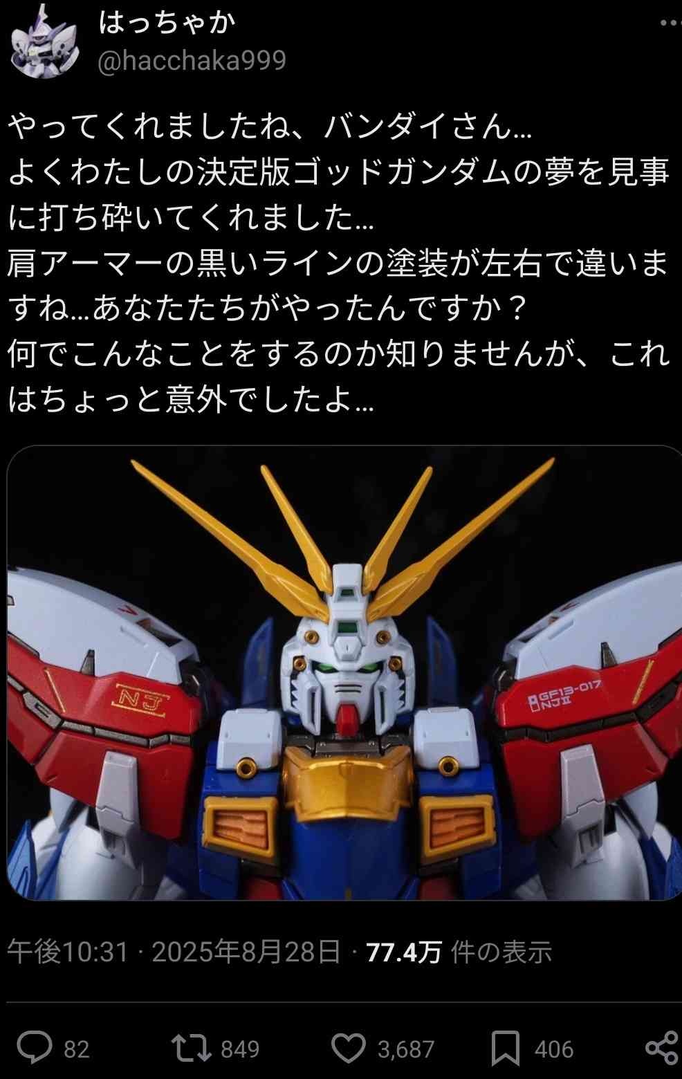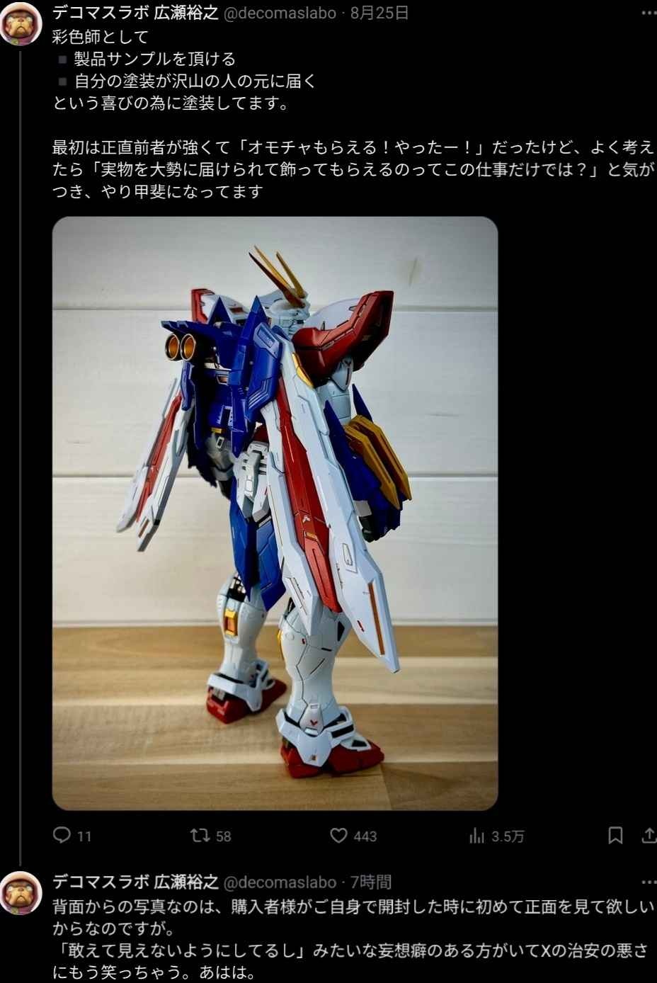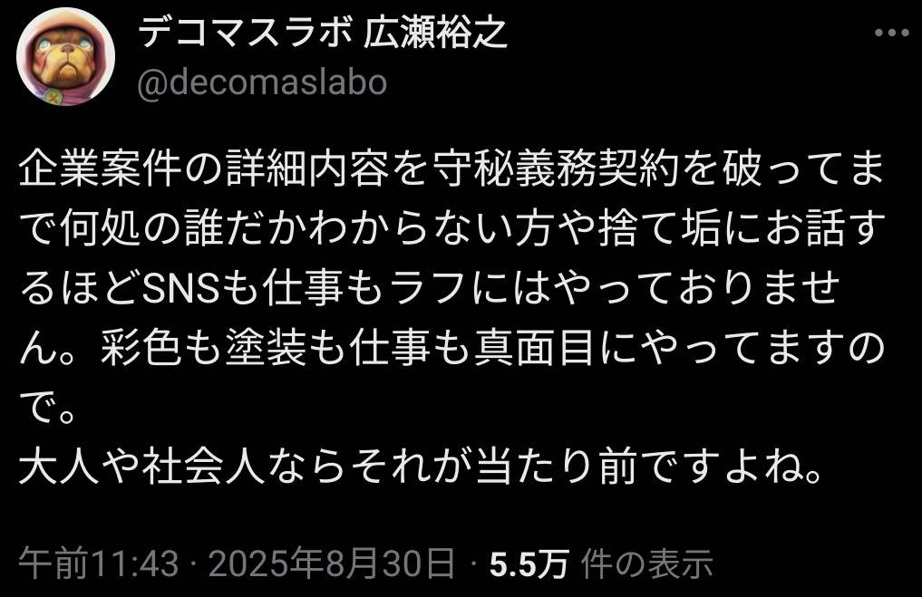 「企業案件に関わる内容については、守秘義務を遵守し、SNS上で誰か分からない方や匿名のアカウントにお話しすることはありません。彩色や塗装、そして仕事そのものにも真摯に取り組んでおります。それは社会人として当然の姿勢だと考えております。」