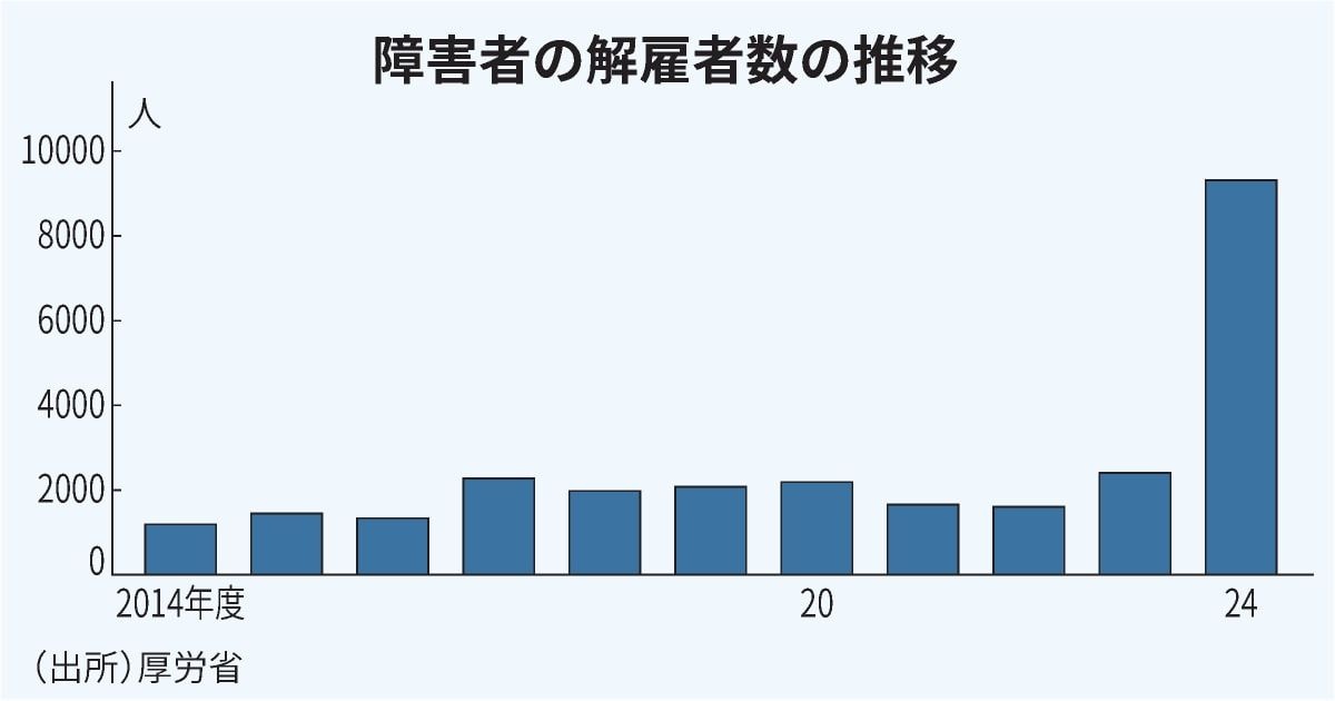 解雇された障がい者の数が2024年度は9312人と前年度の3.8倍に膨らみ、過去最多になった。経営に問題がある事業者の排除・改善を狙った国の報酬見直しによって事業の閉鎖や縮小を迫られたケースが増えたとみられる。再就職も進んでいない。