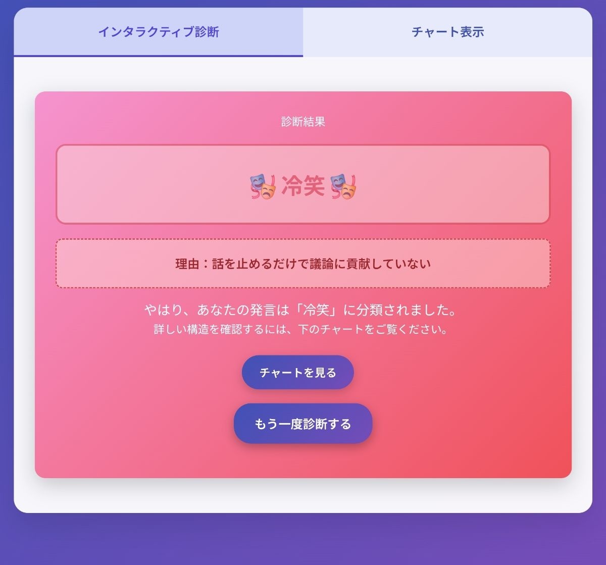そこで私は、このツールを通じて「すべての道は冷笑に通ずる」という状況の不毛さを、あえて時間をかけて作業化し、可視化することで示そうと考えました。冷笑を冷笑と呼び、何もかもを冷笑に分類することが、いかに虚しく、自己矛盾を孕み、乱暴であるかを証明するためです。