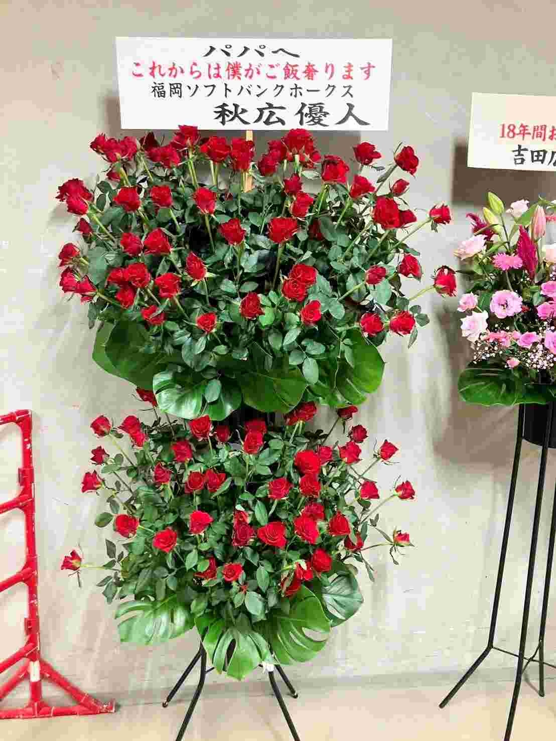 巨人時代に師弟関係を築いた現ソフトバンクの秋広優人からは真っ赤なバラのフラワースタンドが。「パパへ これからは僕がご飯奢ります」とメッセージがつづられていた。
