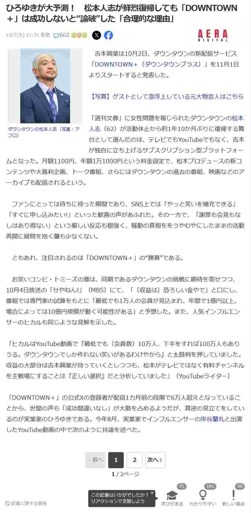 「ヒカルはYouTube動画で『最低でも(会員数)10万人、下手をすれば100万人もありうる。ダウンタウンでしか作れない笑いがあるわけやから』と太鼓判を押していました。収益の大部分は吉本興業が持っていくとしつつも、松本がテレビではなく有料チャンネルを主戦場にすることは『正しい選択』だと分析していました」