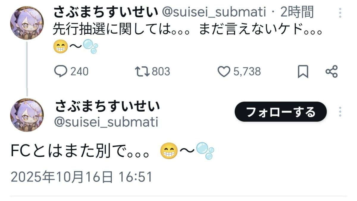 公式FCのコンテンツ(何が出るか知らないけど)や施策は基本的に参加しないって運営さんにお話ししてOKもらってるので、期待して入ってる人いたらごめんねっっっっっ🥹