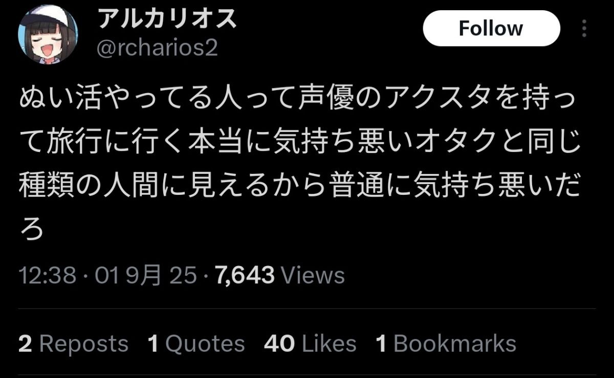 最近は男の人も普通にぬいぐるみやアクスタとの写真撮ってるところに出くわすな