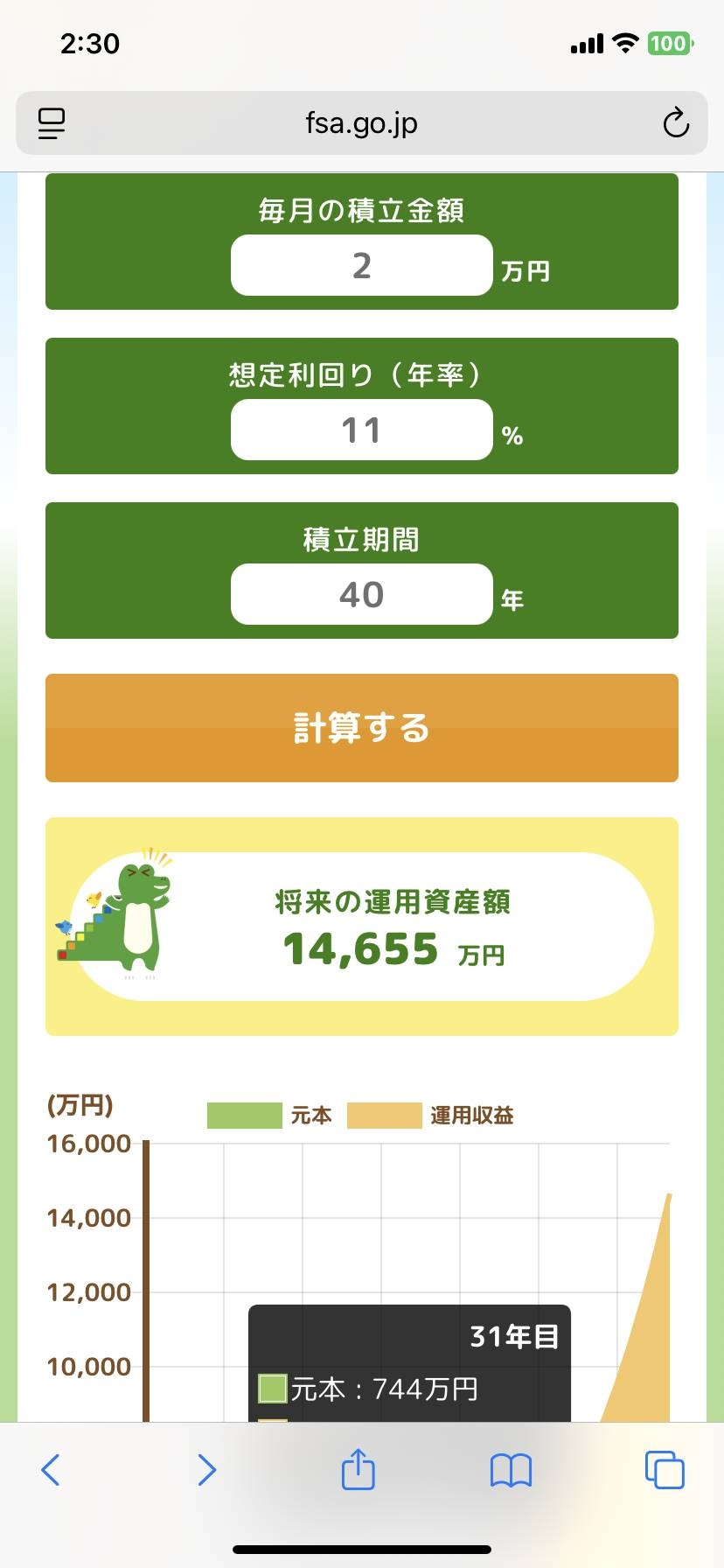 S&Pの平均年利が設立以降11%くらいらしいのでそれで月2万を40年積み立てた結果