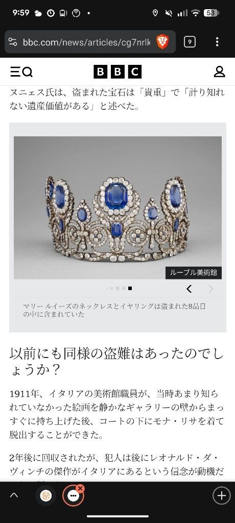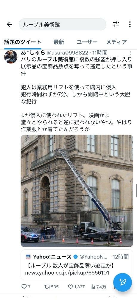 フランス・パリの観光名所ルーブル美術館に19日、4人組の強盗団が押し入り、展示品の宝飾品8点を奪って逃走した。 【写真特集】ハプスブルク家の宝 検察当局が明らかにした。来館者は避難し、けが人はいなかった。美術館は臨時閉館され、警察が犯人の行方を追っている。 ヌニェス内相は地元ラジオに、強盗団が現場にいたのはわずか7分間だったと説明。「手慣れたグループ」による周到な犯行との見方を示した。 事件があったのは開館後の19日午前9時半(日本時間同日午後4時半)ごろ。犯人らは高所作業車で美術館に乗り付け、上階の窓ガラスを割って侵入。厳重警備対象の二つの展示ケースを壊してティアラや冠、ブローチを取り出すと、用意していたバイクで逃走した。