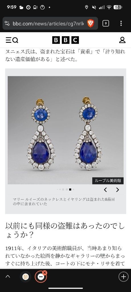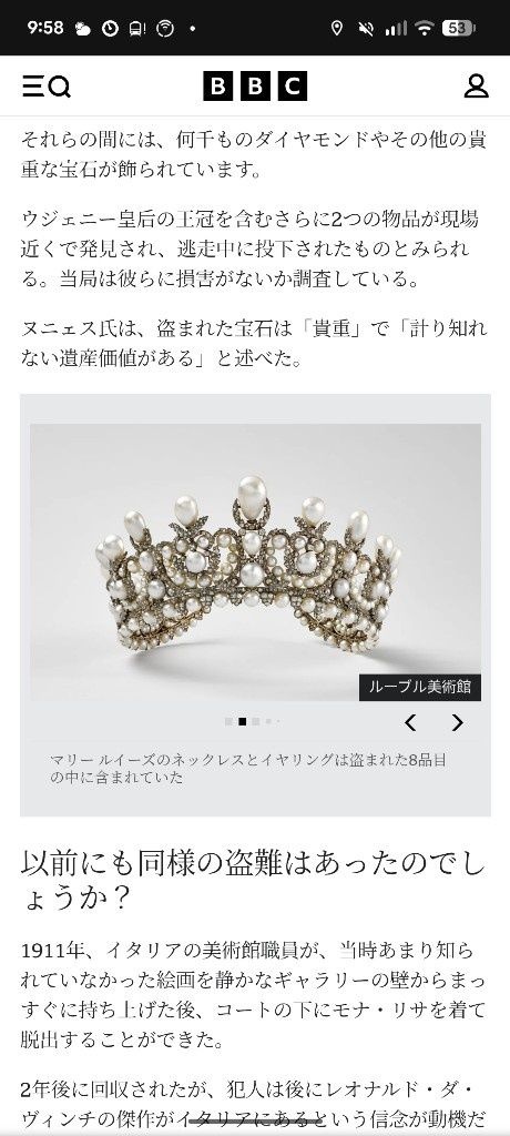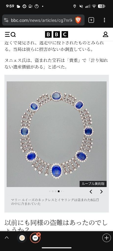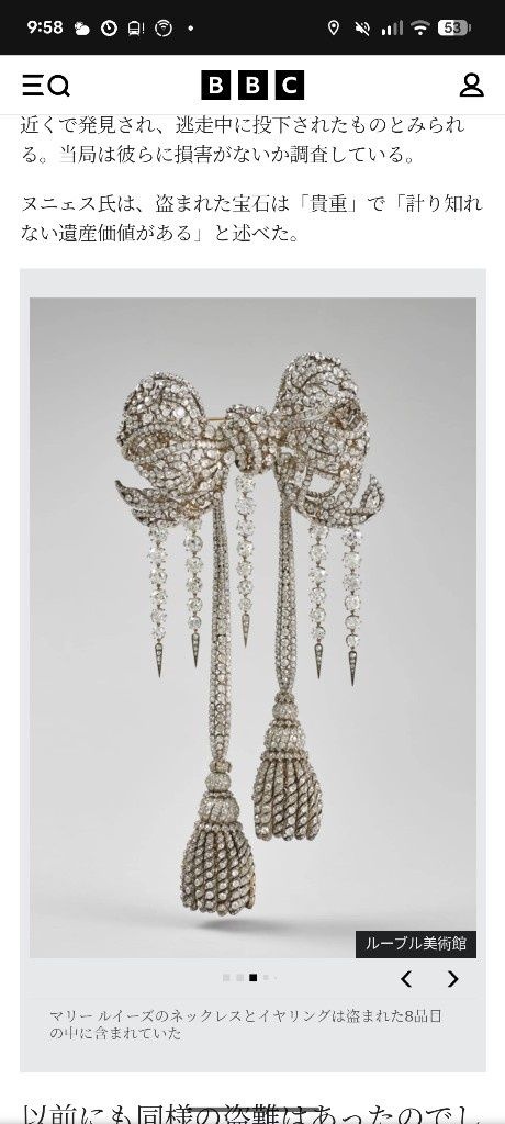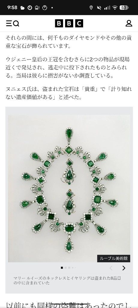 盗まれた8点には、19世紀のフランス皇帝ナポレオン1世から皇后マリルイーズへの贈り物で、ダイヤ、エメラルドをちりばめたネックレスとイヤリングも含まれる。一方、冠は強盗団が逃走途中に放棄した状態で見つかり、回収された。被害総額は明らかになっていない。 パリジャン紙(電子版)によると、現場にはガスバーナー、ガソリン、トランシーバーが残されていた。捜査当局は遺留品や監視カメラ映像から、犯人の特定と逃走先の割り出しを進める。