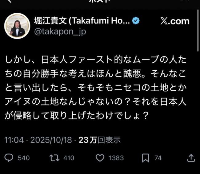 ホリエモン「ニセコは元々アイヌ人の土地なのに日本人が侵略して奪ったもの」