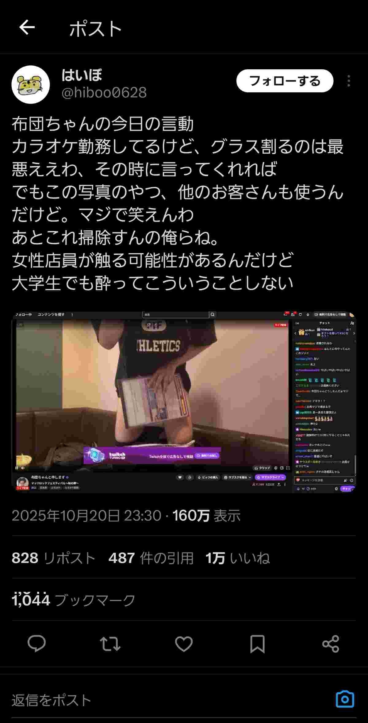 カラオケ配信でグラスを割り、その後酔った勢いで出したちんちんをメニュー表で隠すもそのメニュー表もう汚くて使えねえじゃんと正論パンチ