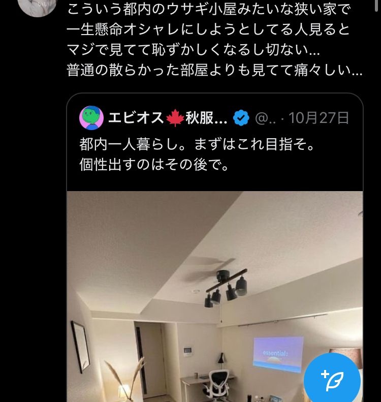こういう都内のウサギ小屋みたいな狭い家で一生懸命オシャレにしようとしてる人見るとマジで見てて恥ずかしくなるし切ない…