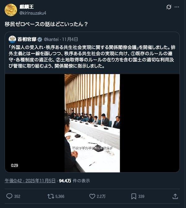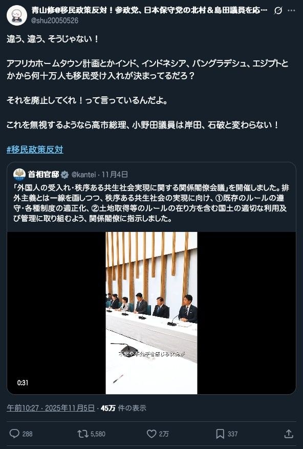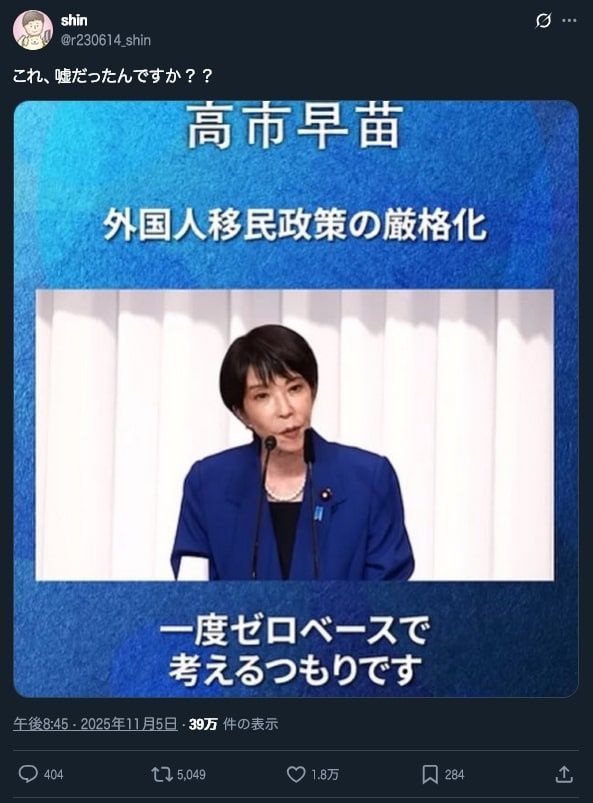 高市「不法移民は追放するけど合法の移民はガンガン入れてくで~」