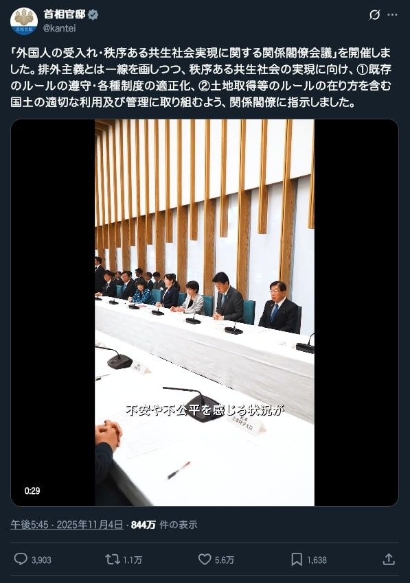 「外国人の受入れ・秩序ある共生社会実現に関する関係閣僚会議」を開催しました。排外主義とは一線を画しつつ、秩序ある共生社会の実現に向け、①既存のルールの遵守・各種制度の適正化、②土地取得等のルールの在り方を含む国土の適切な利用及び管理に取り組...