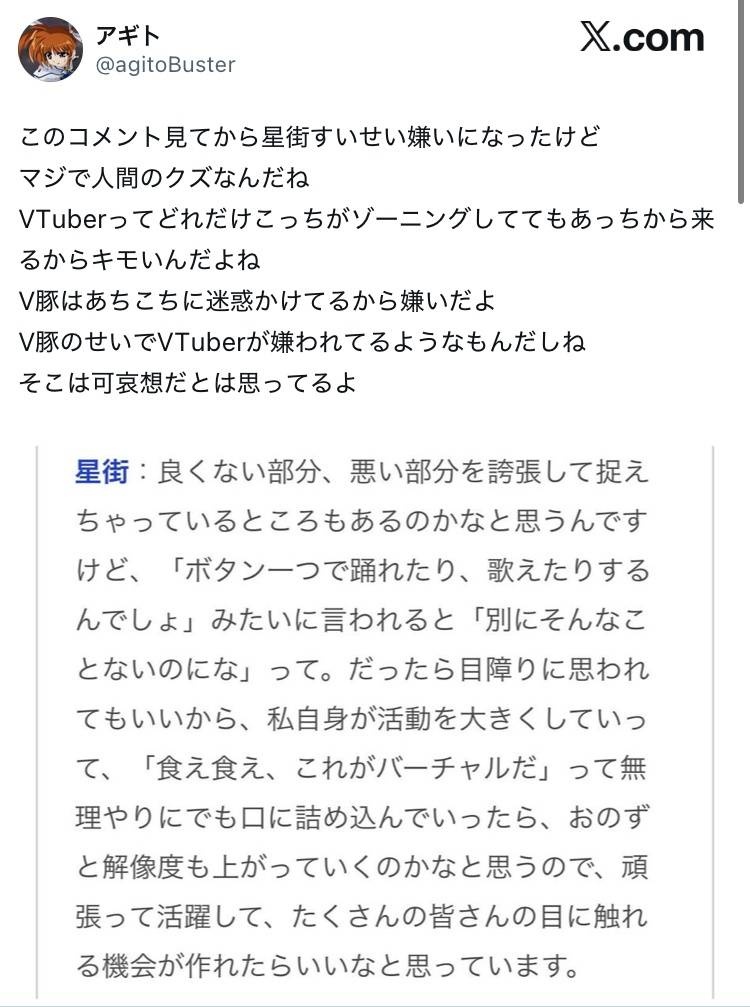 コラボに対してVが出しゃばるなって怒り心頭なやついるけどこの言い分だけ流石にわけわからんアンチ極まりすぎて頭がウンチになっとるやん
