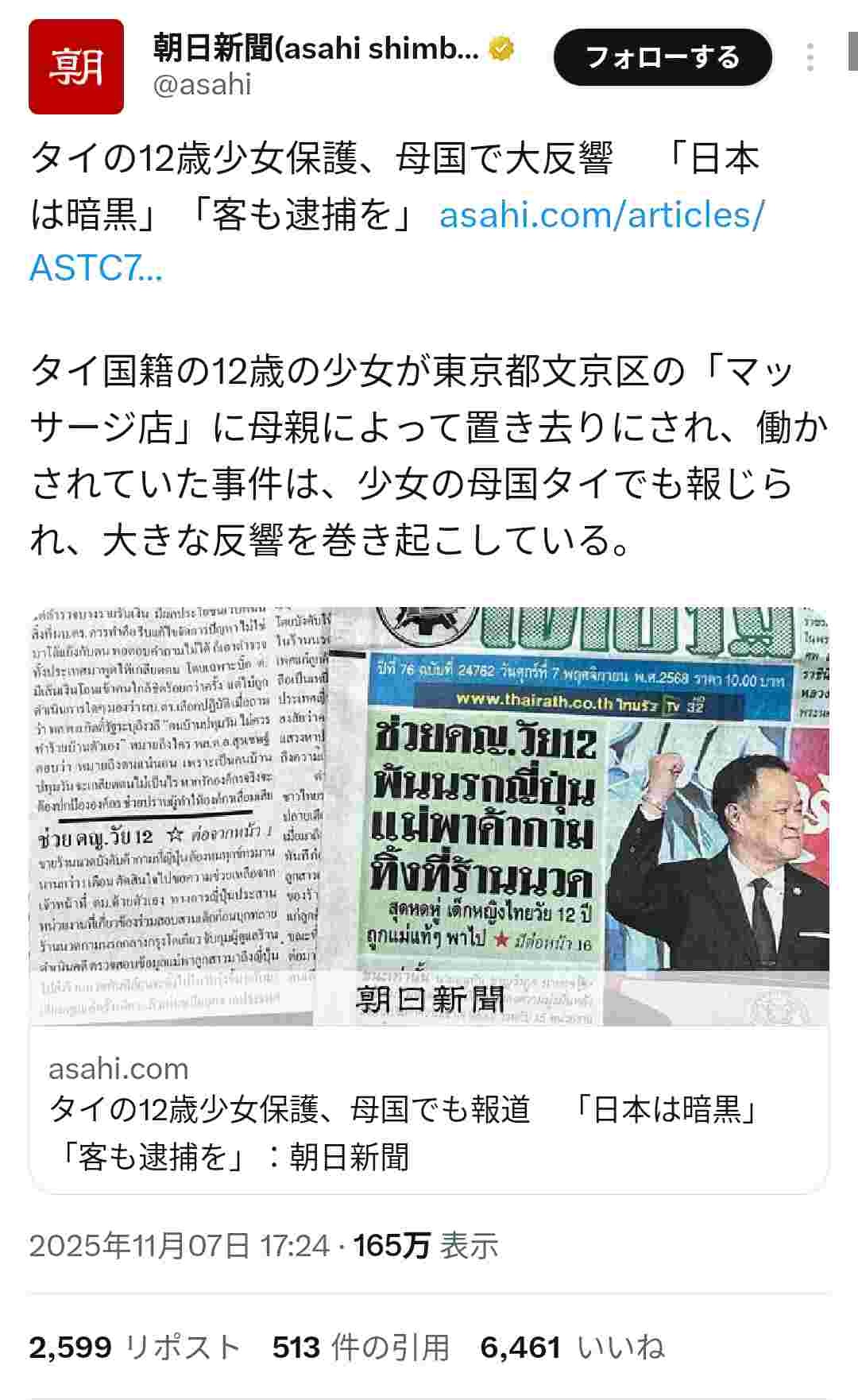 タイ人(12)を違法風俗で働かせてた件、タイ国内で大騒ぎになり収拾がつかなくなる→「客も逮捕しろ!!」
