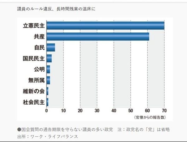 元霞が関の住人から言わせると、とにかく野党の締切が遅い。菅直人、長妻さんには本当に悩まされた。特に前者は午前零時を越して追加質問。関係省庁と答弁のすり合わせをして終わるのが朝4時。大臣レクは朝7時半。ルールは守ってほしいと心から思っていましたが。今は改善されたのかしら。