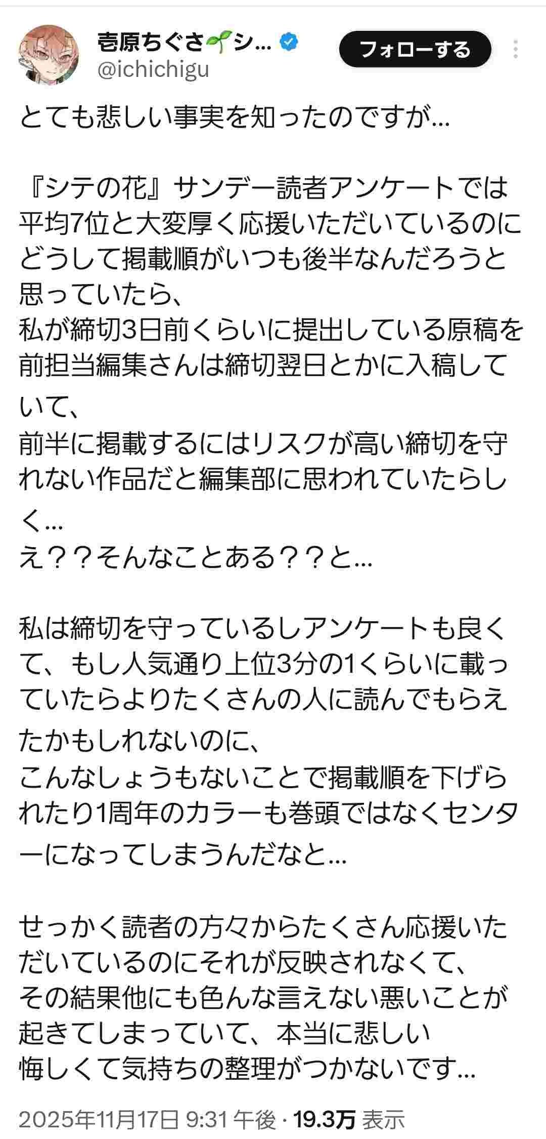 『シテの花』サンデー読者アンケートでは平均7位と大変厚く応援いただいているのにどうして掲載順がいつも後半なんだろうと思っていたら、