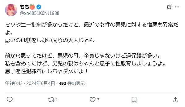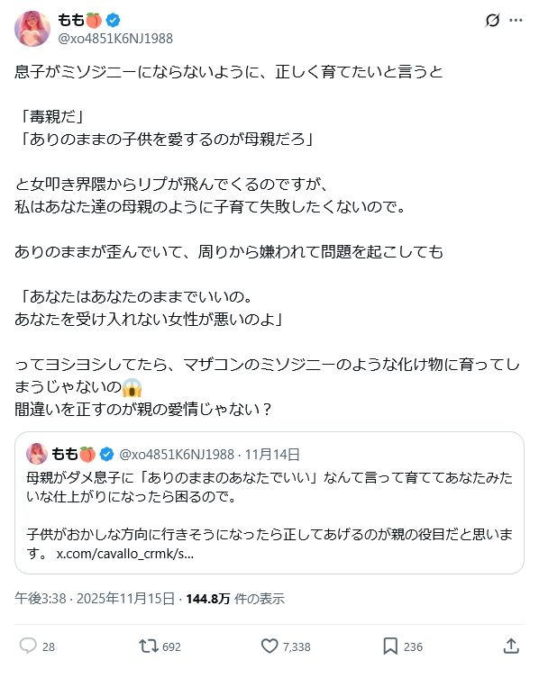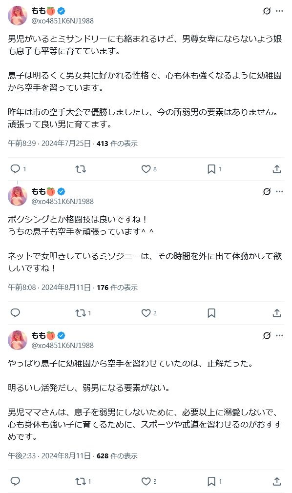 ・男児を育てているとXでミサンドリー(女尊男卑)に絡まれるため、息子と娘をミソジニー(男尊女卑)にしないように教育