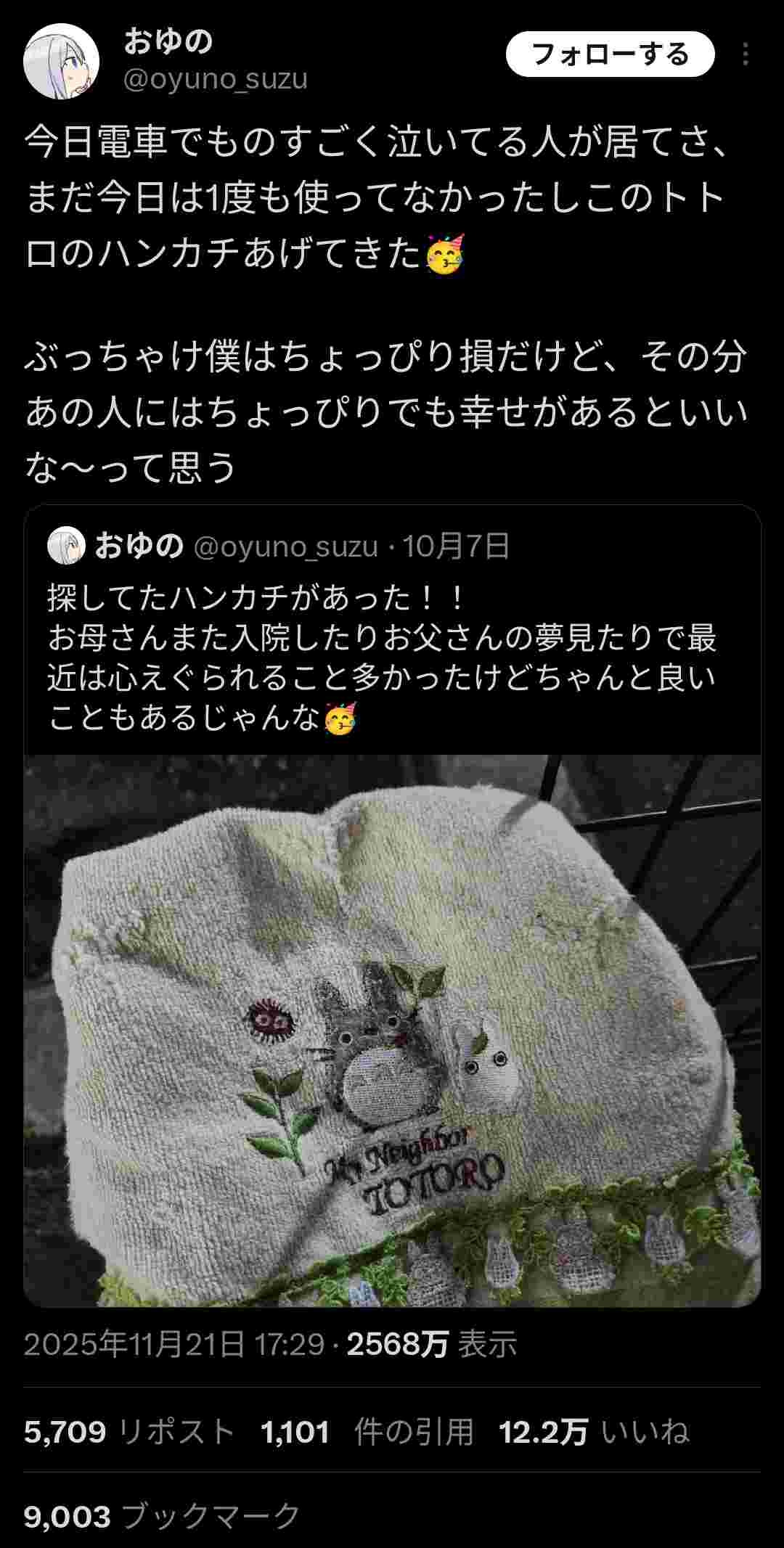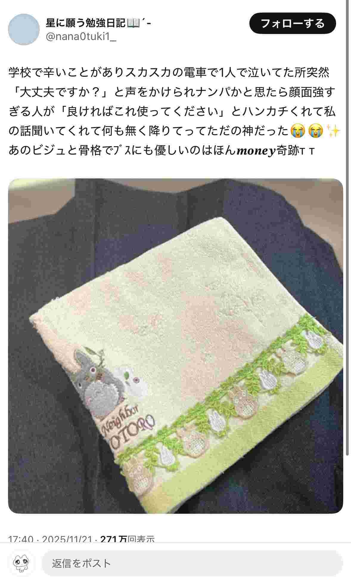 しかもめちゃめちゃ大事なハンカチだったらしいのに相談まで聞いてあげた上でこれなんか