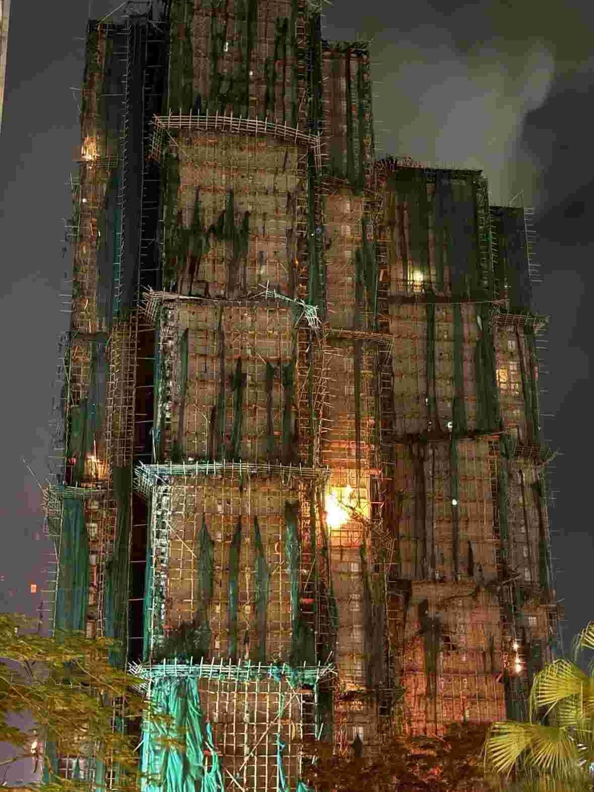 原因はまだ不明。高層住宅は改修工事中で、建物の外側に竹製の足場が組まれていた。
