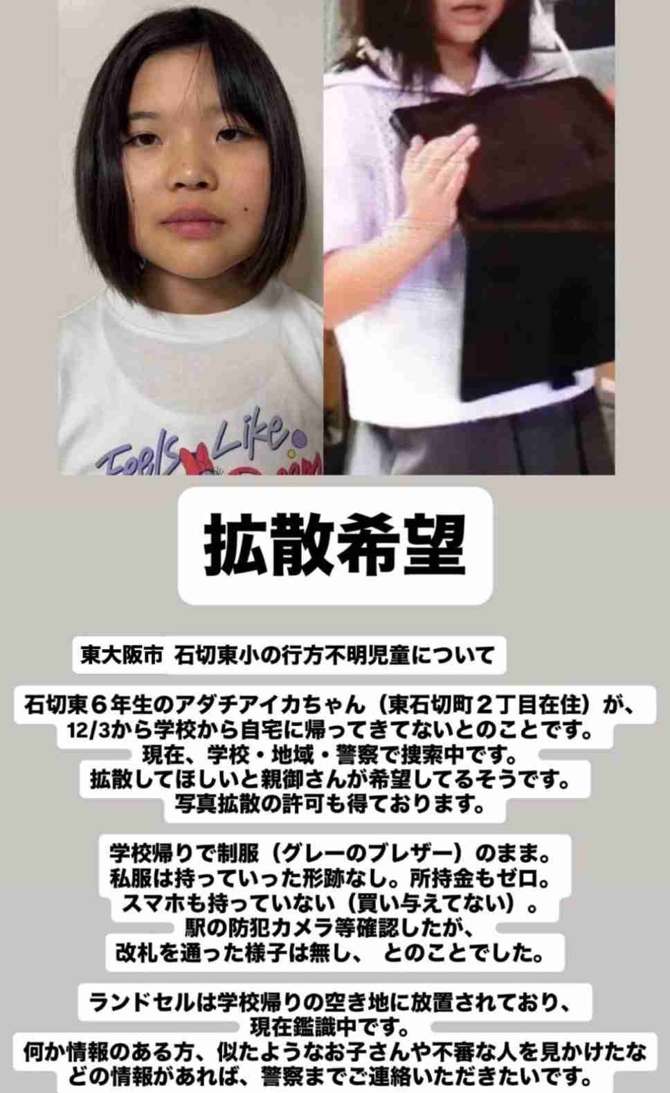 大阪の女子小学生「アダチアイカ」ちゃんが昨日から行方不明に