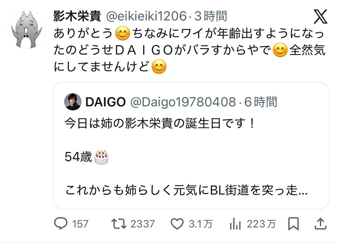 昔、テレビで姉の年齢は非公開って話をしたときに「何歳差なん?」って聞かれて「7歳差っす!」って答えて「DAIGO何歳なん?」って聞かれて「30歳っす!」って言って一瞬で年齢特定されたくだり笑ったわ