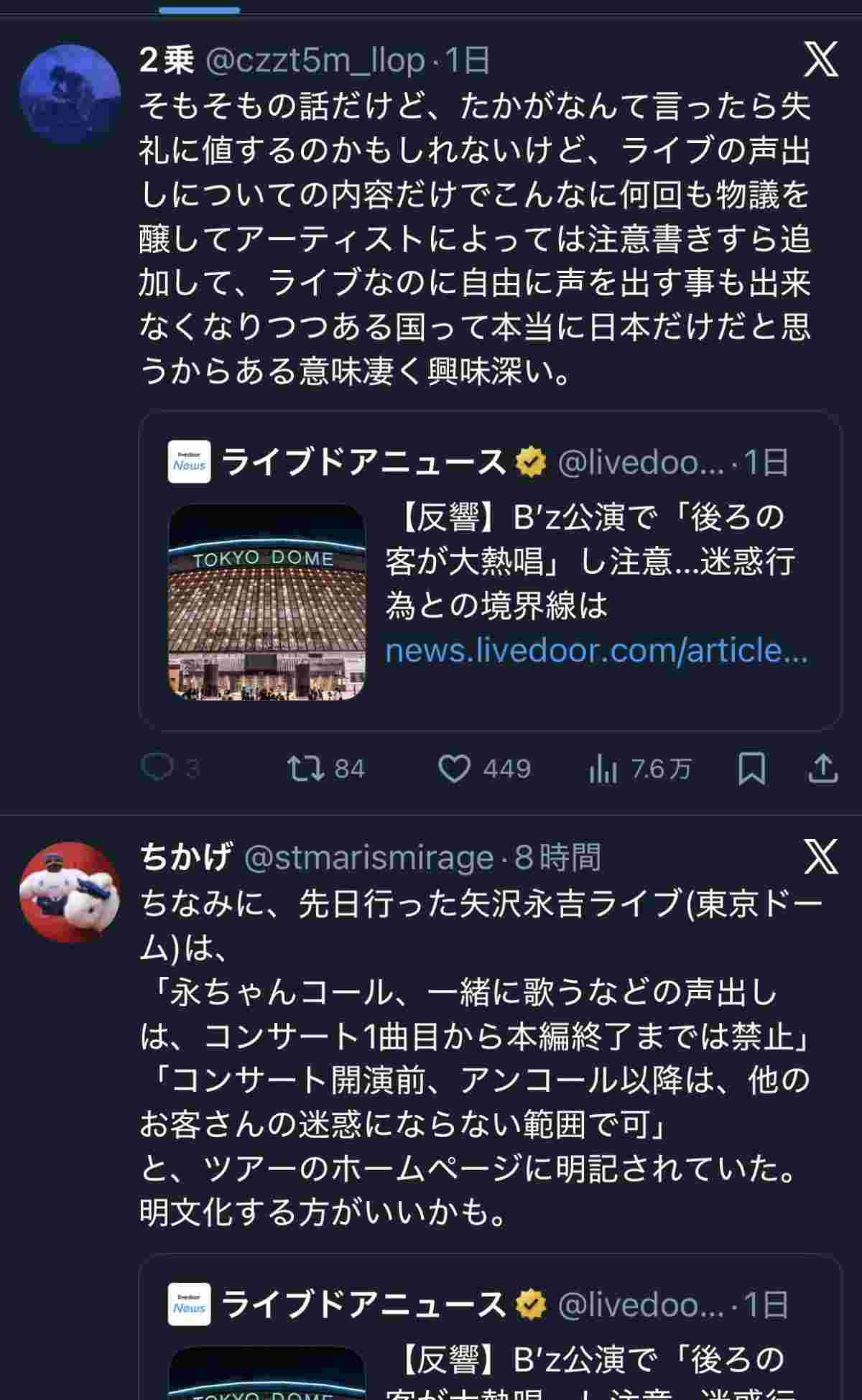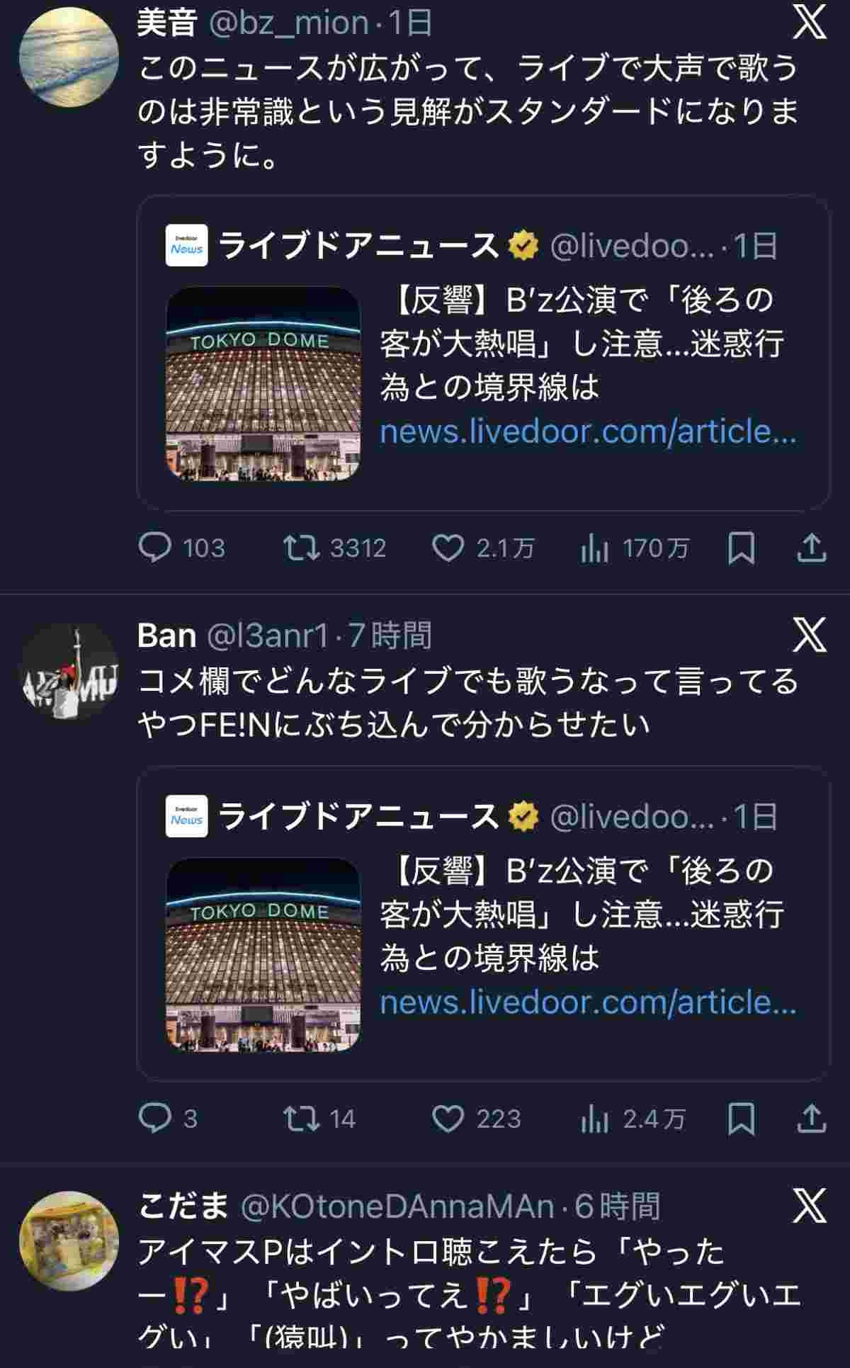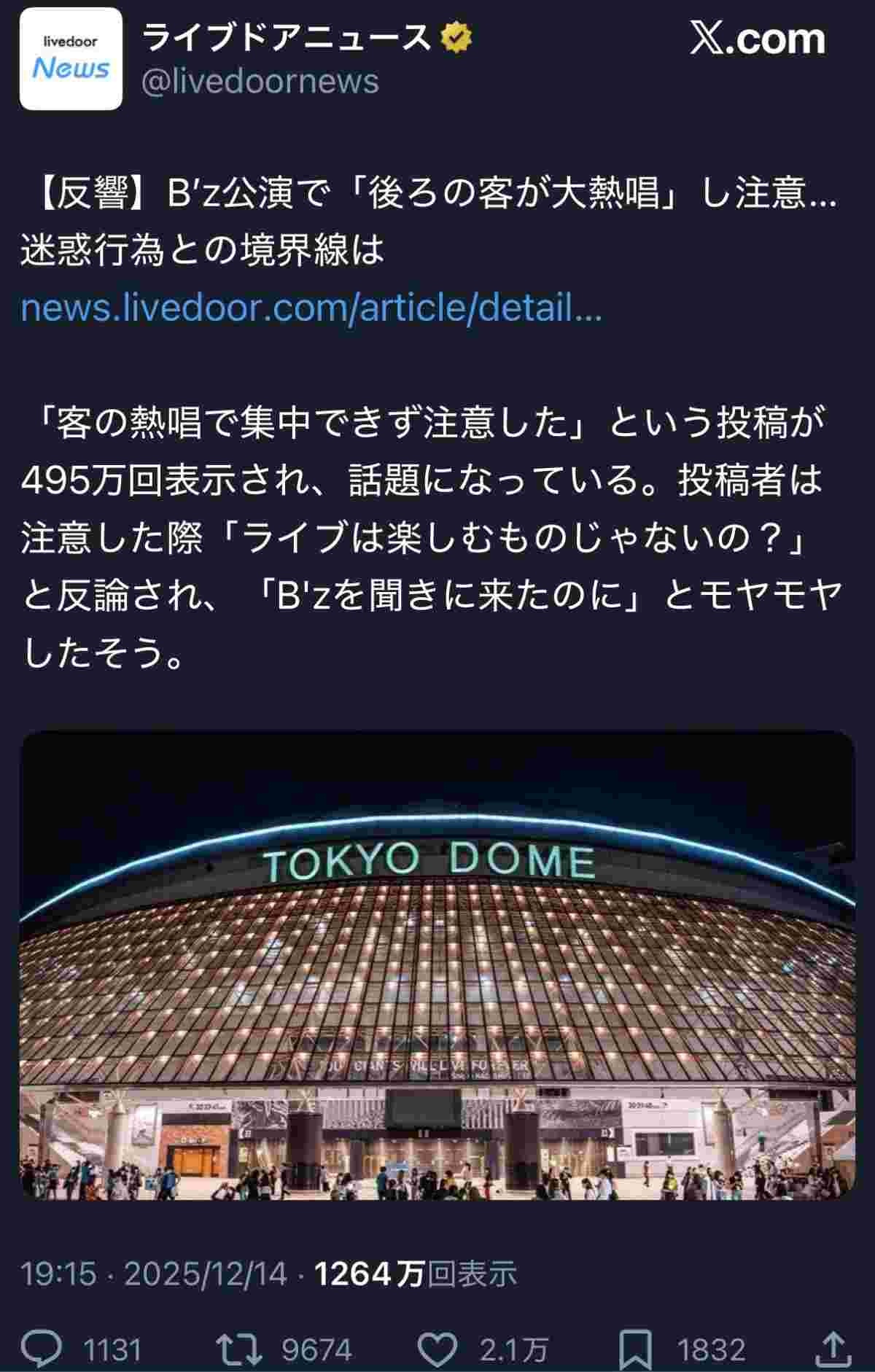「客の熱唱で集中できず注意した」という投稿が495万回表示され、話題になっている。投稿者は注意した際「ライブは楽しむものじゃないの?」と反論され、「B’zを聞きに来たのに」とモヤモヤしたそう。