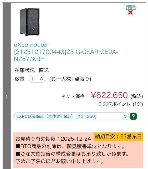 違うBTOショップに見積もり出してたエッジャーは買えた感じやったから