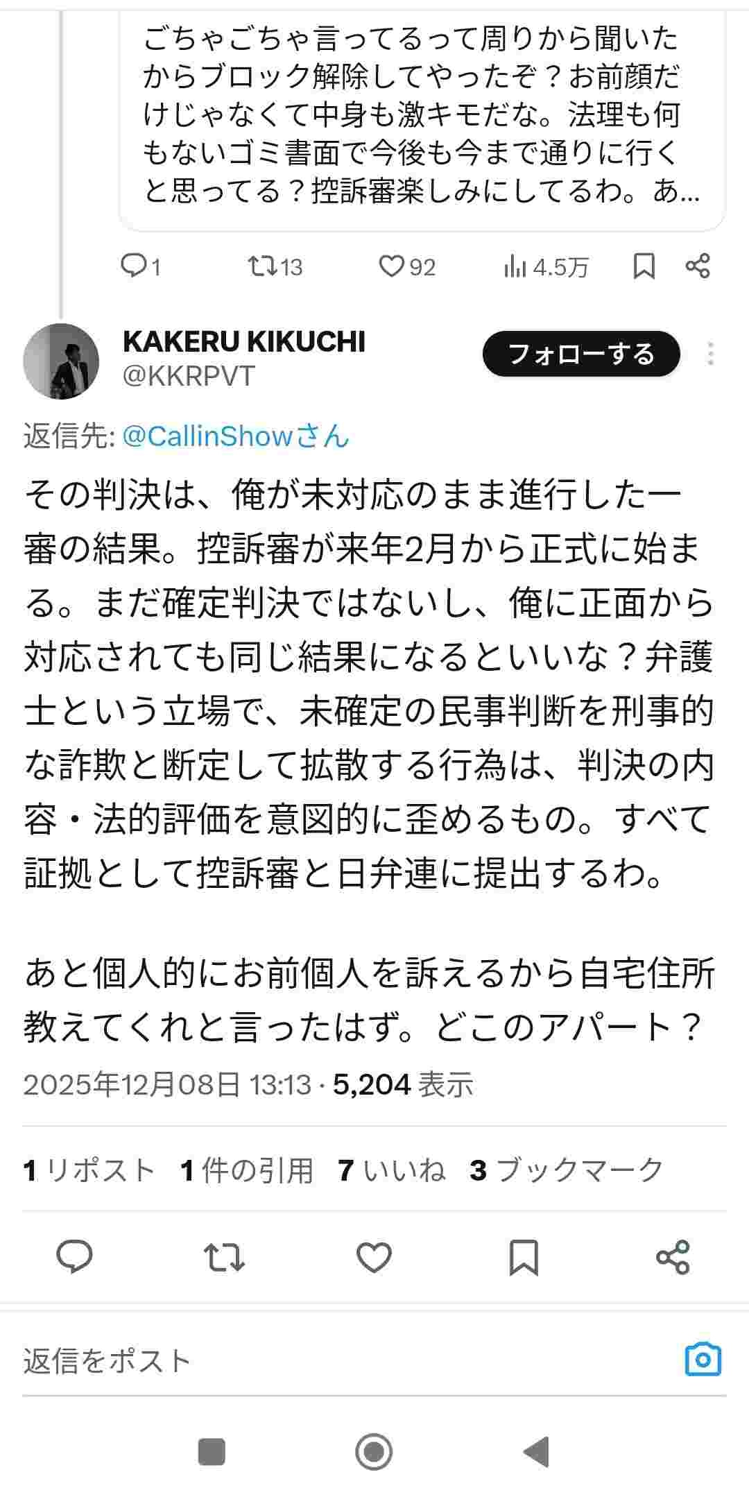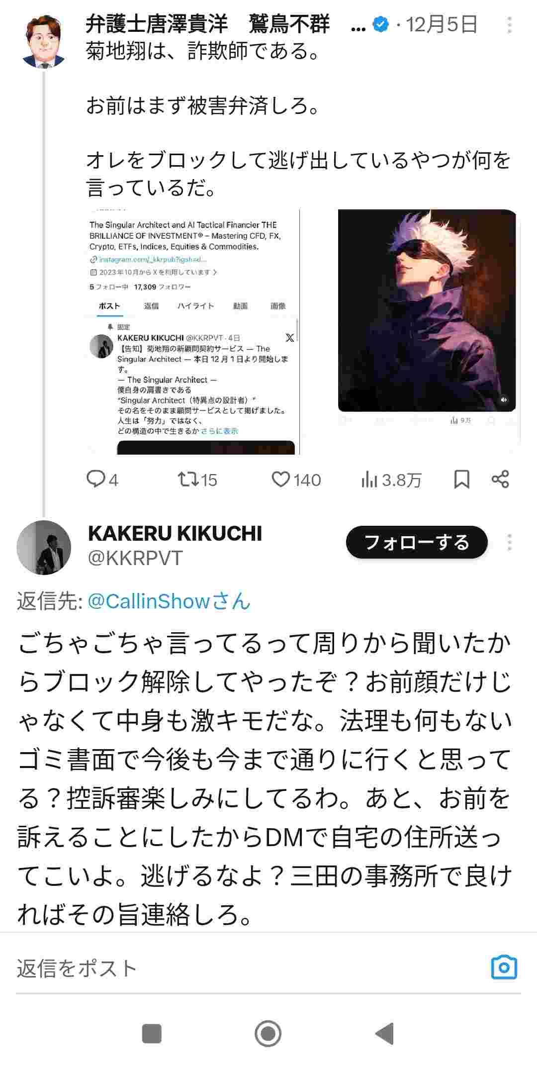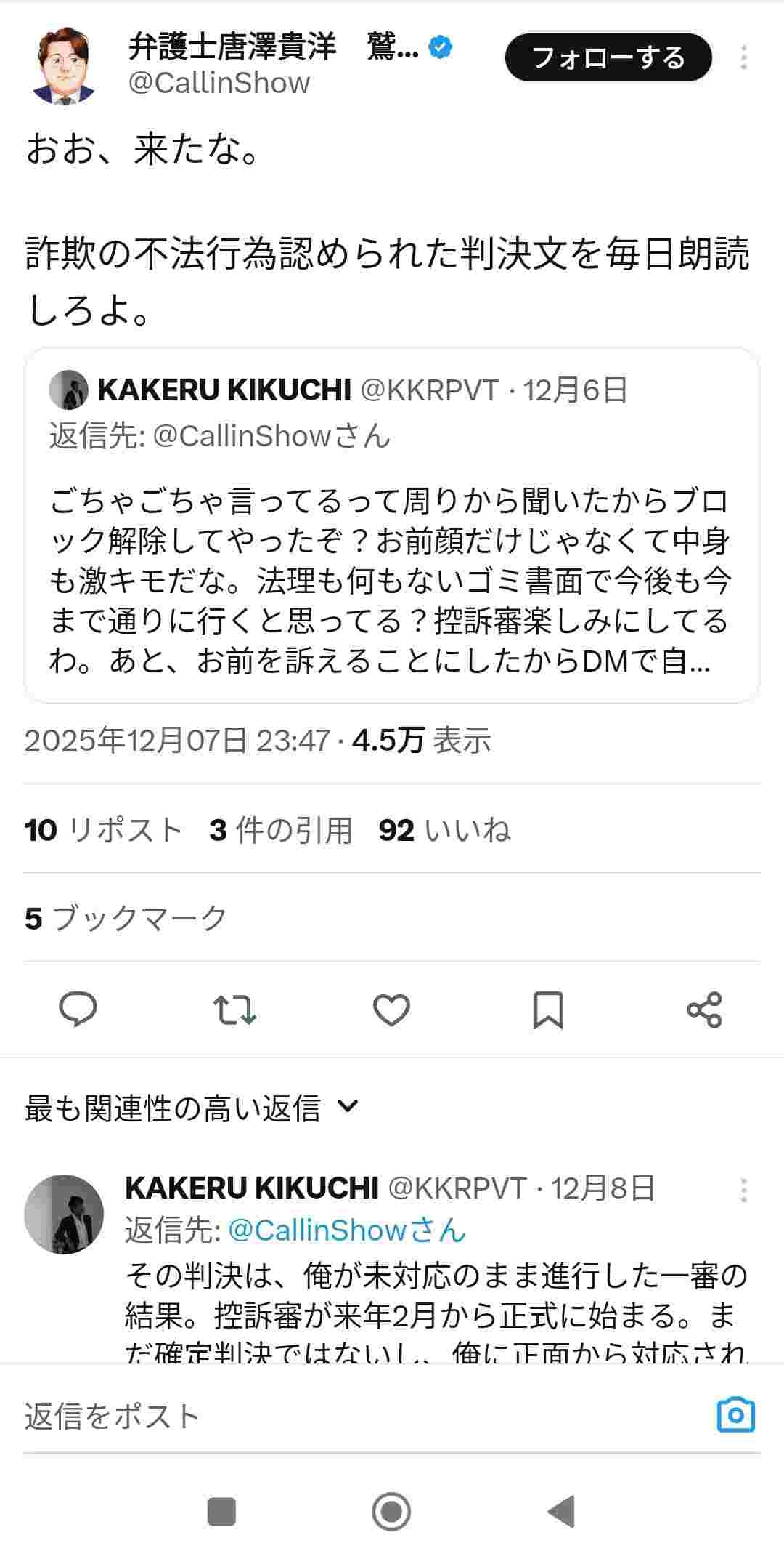 ずっと唐澤貴洋が粘着していた菊池翔に「訴える」と言われてから何も投稿しなくなった模様
