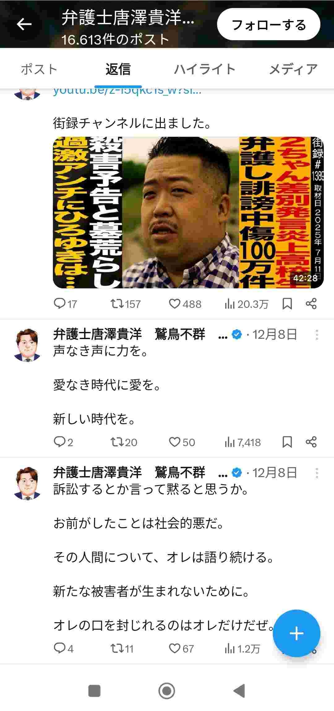 【遂に殺されたか】唐澤貴洋、12/8からXの投稿なし【長谷川亮太】