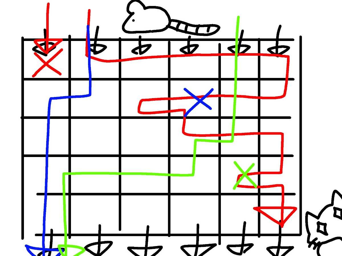 ネズミは一番上の列のタイルに入って、辺でせっしたいずれかのタイルへいどうし、一番下の列のタイルへ行きますが、ねこと同じタイルにのると食べられてしまいます。