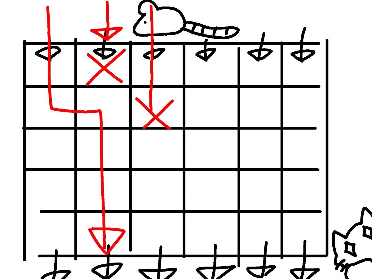まず, ターボ君は開始地点となるマスを 1 行目から選ぶ. そして, 今いるマスと辺を
