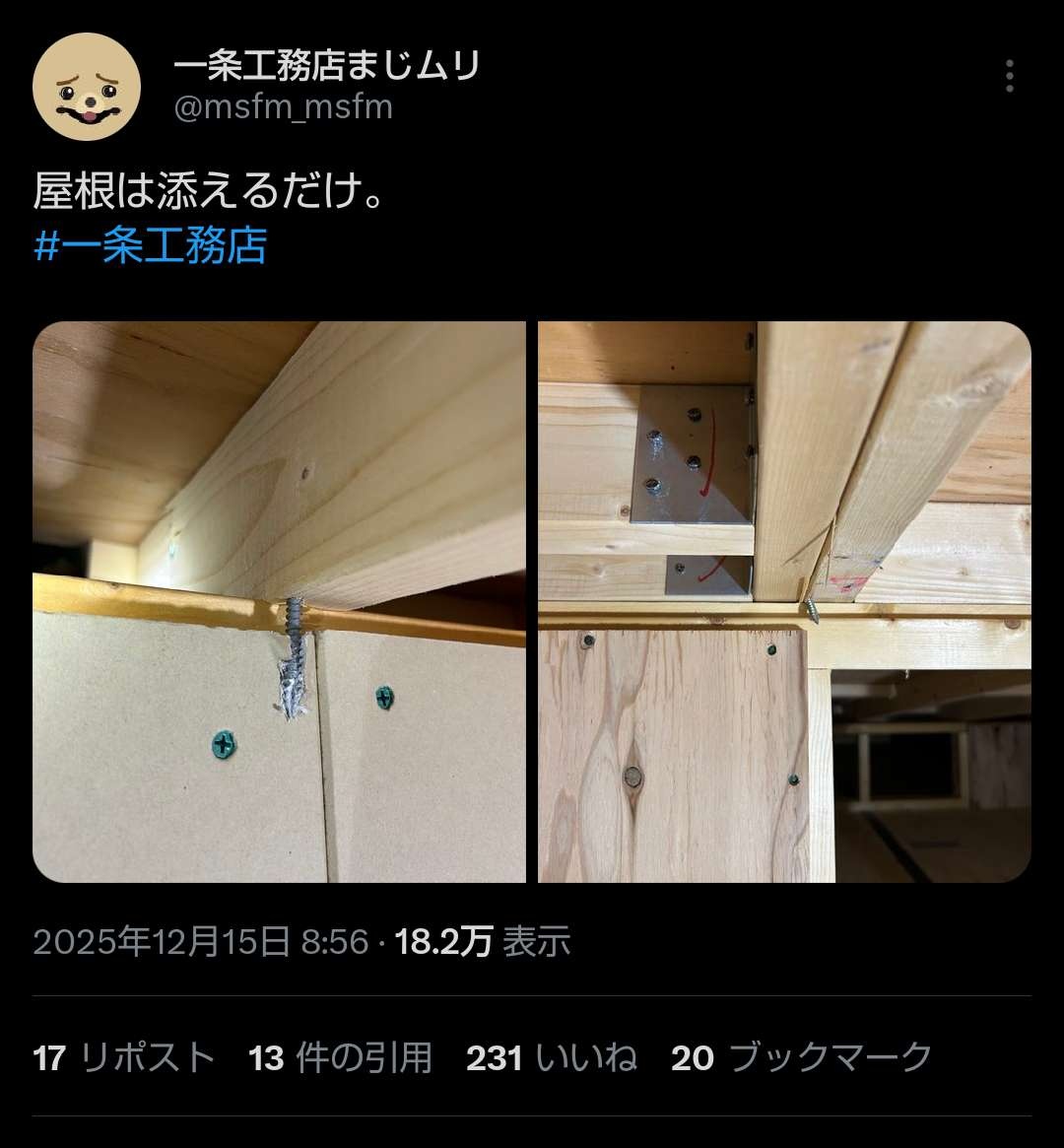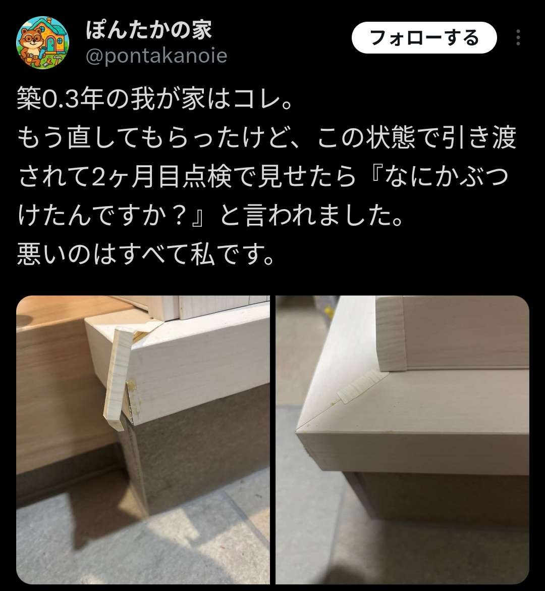 組み立て終わって中が見れない状態で売る建売なんか売る側からするとちゃんと作る意味がないしユーザーも無知やから建材のグレードとかわからんやろし手を抜く要素しかないわ