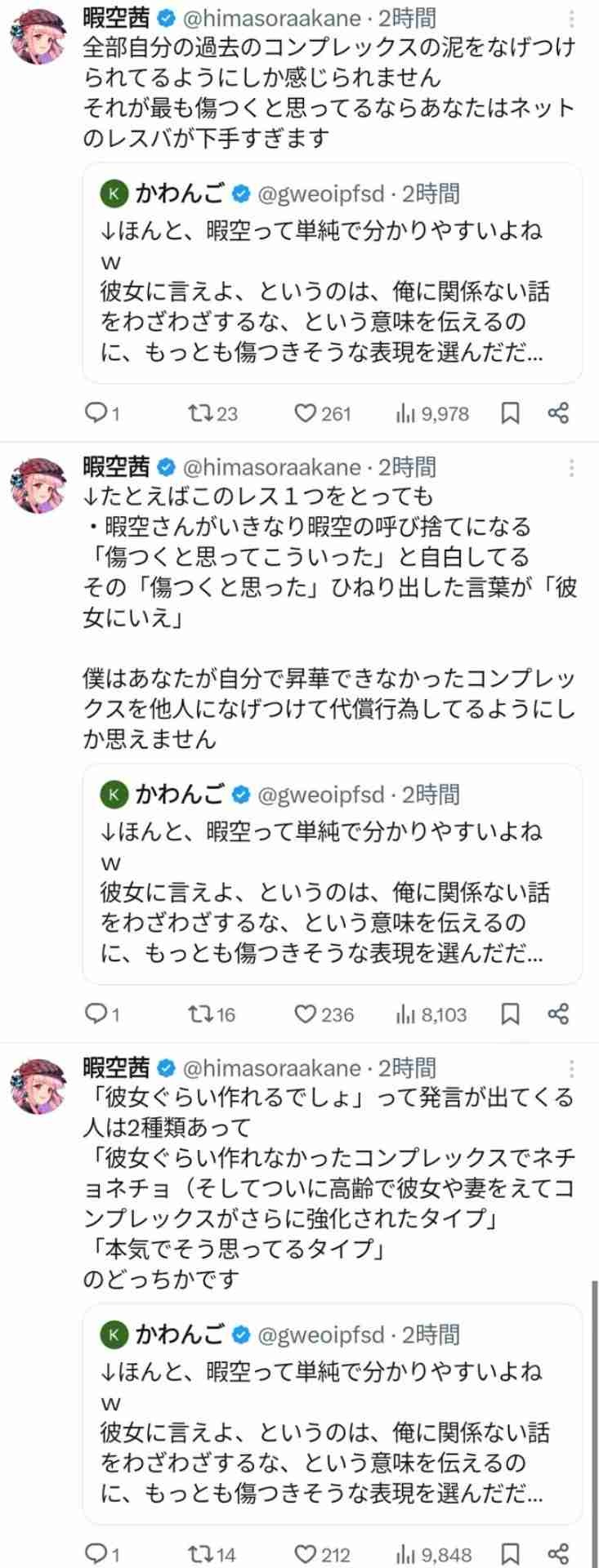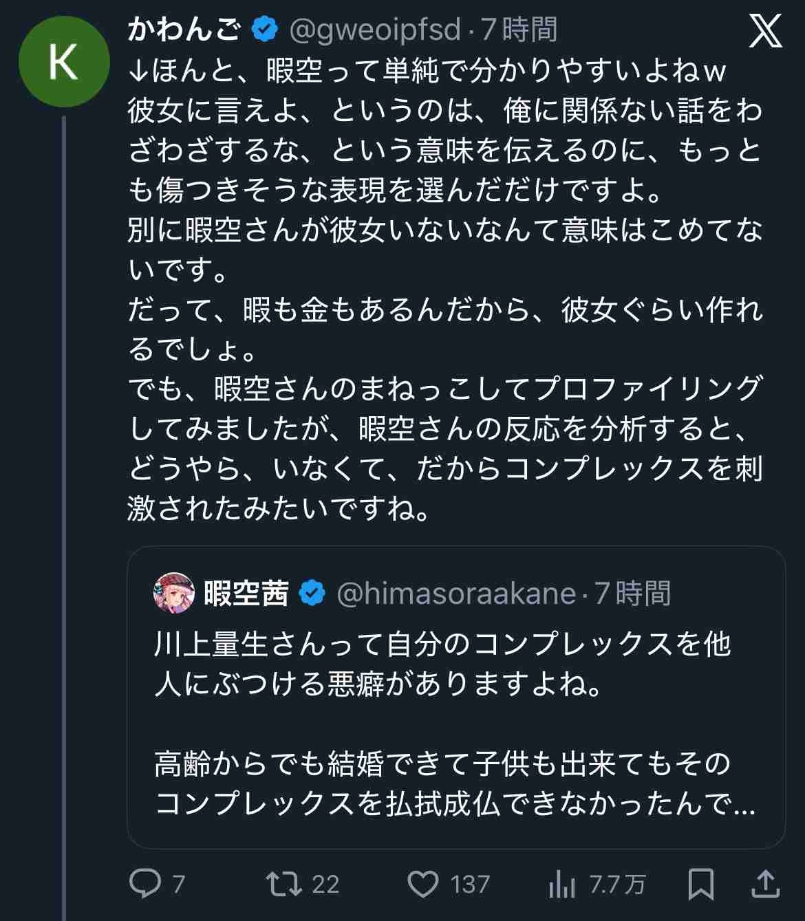 暇空なんぞにこんな煽りレスバ仕掛けていってる時点で川上の負けや