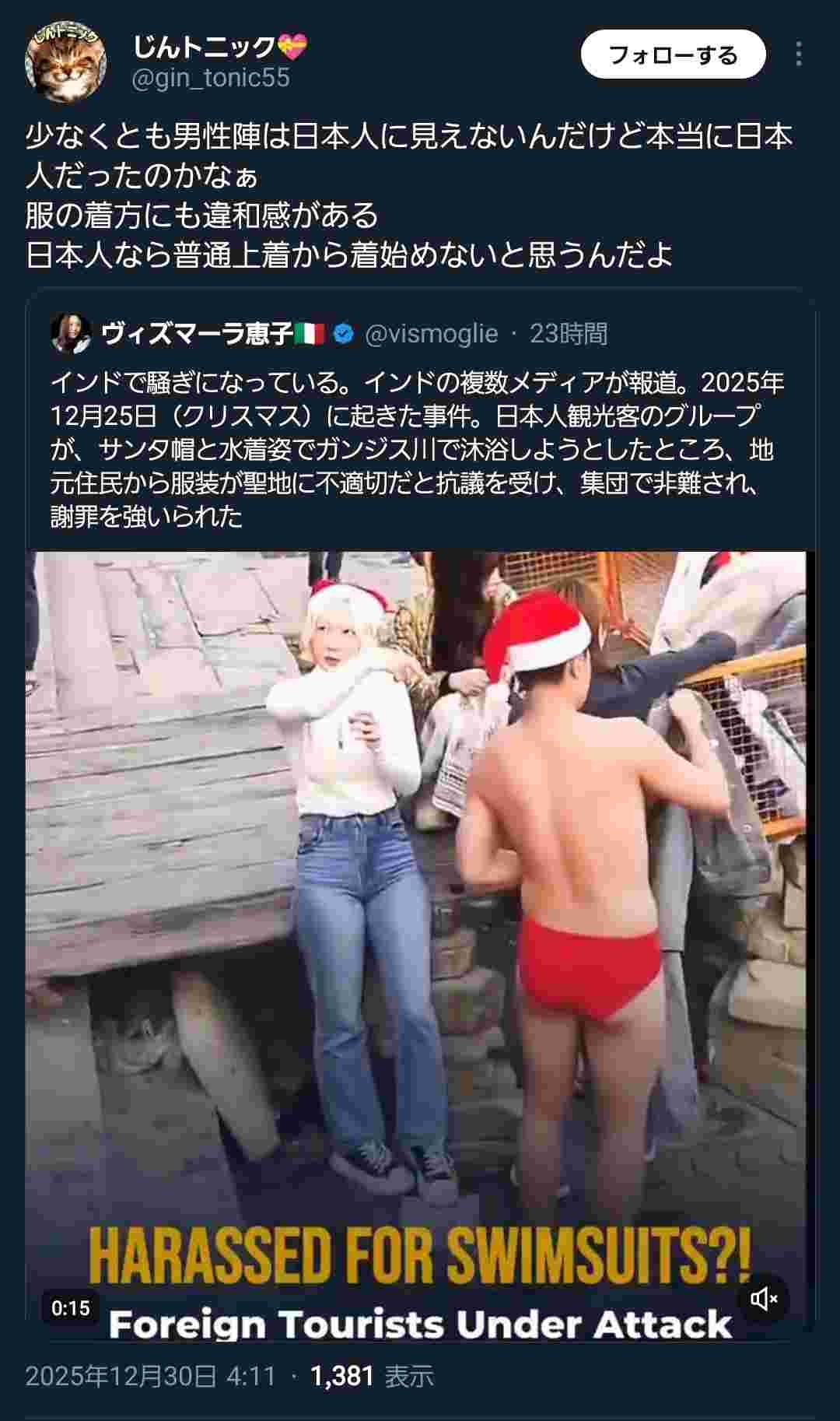 インドで騒ぎになっている。インドの複数メディアが報道。2025年12月25日(クリスマス)に起きた事件。日本人観光客のグループが、サンタ帽と水着姿でガンジス川で沐浴しようとしたところ、地元住民から服装が聖地に不適切だと抗議を受け、集団で非難され、謝罪を強いられた