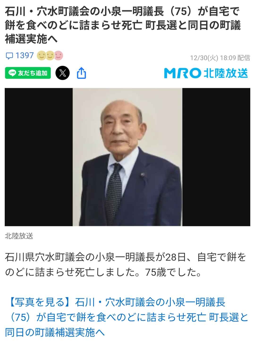 石川県穴水町議会の小泉一明議長が28日、自宅で餅をのどに詰まらせ死亡しました。75歳でした。