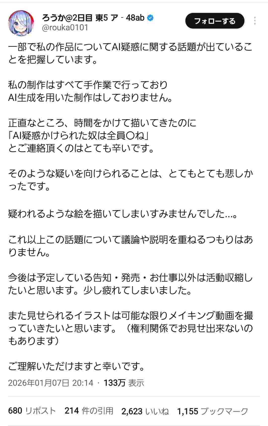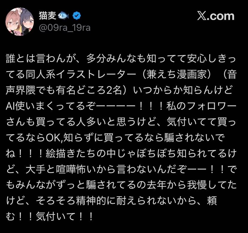 一部で私の作品についてAI疑惑に関する話題が出ていることを把握しています。