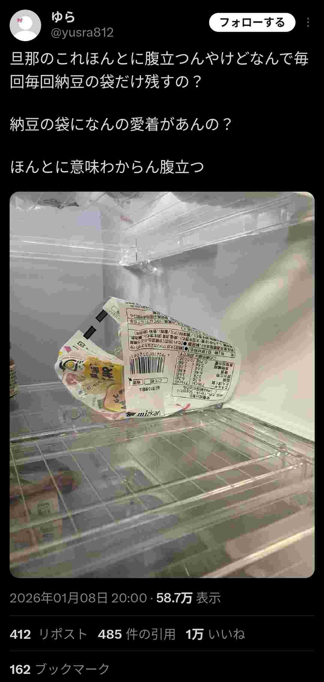 そもそもワイが買ってくる時は冷蔵庫入れる段階で箱外して捨ててるのに嫁が買ってくるとそのまま入れて捨てないの腹立つ