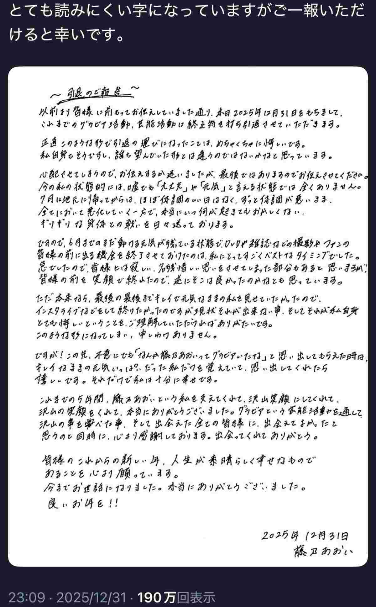 大晦日の直筆のメッセージも多分だいぶ前に書いてて親族に投稿してもらったんやろか