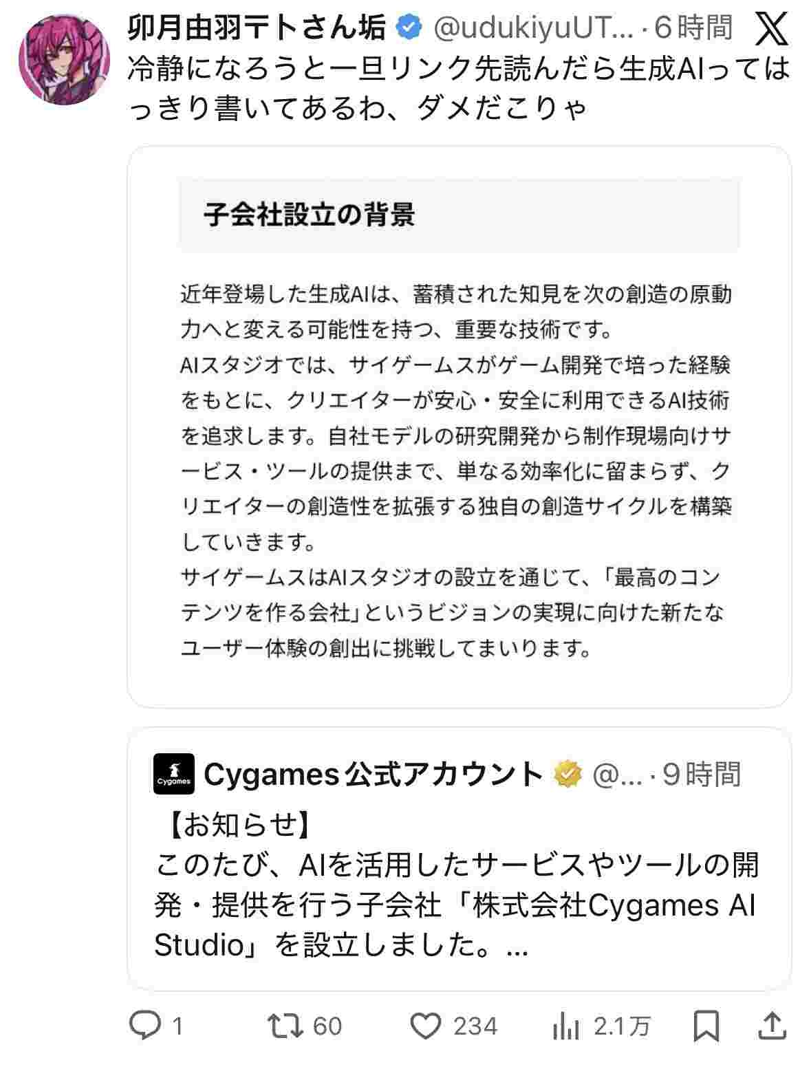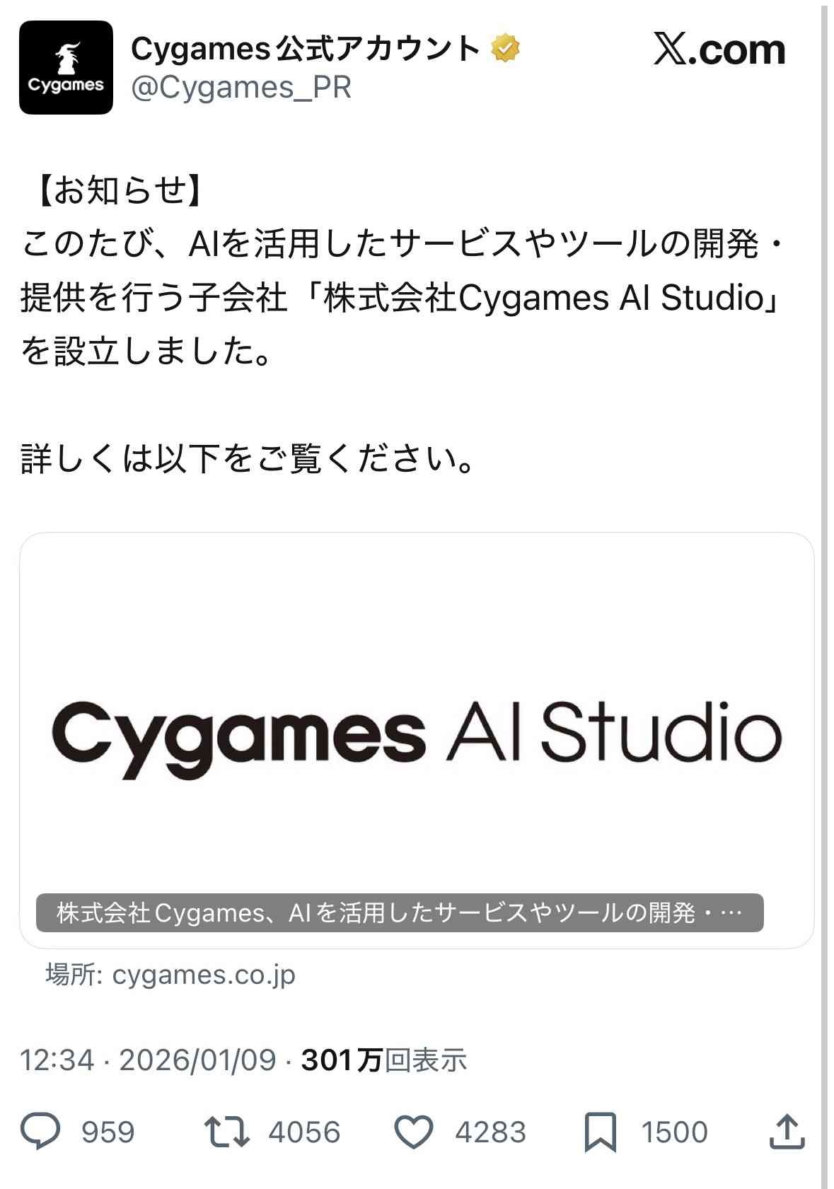 【お知らせ】 このたび、AIを活用したサービスやツールの開発・提供を行う子会社「株式会社Cygames AI Studio」を設立しました。 詳しくは以下をご覧ください。