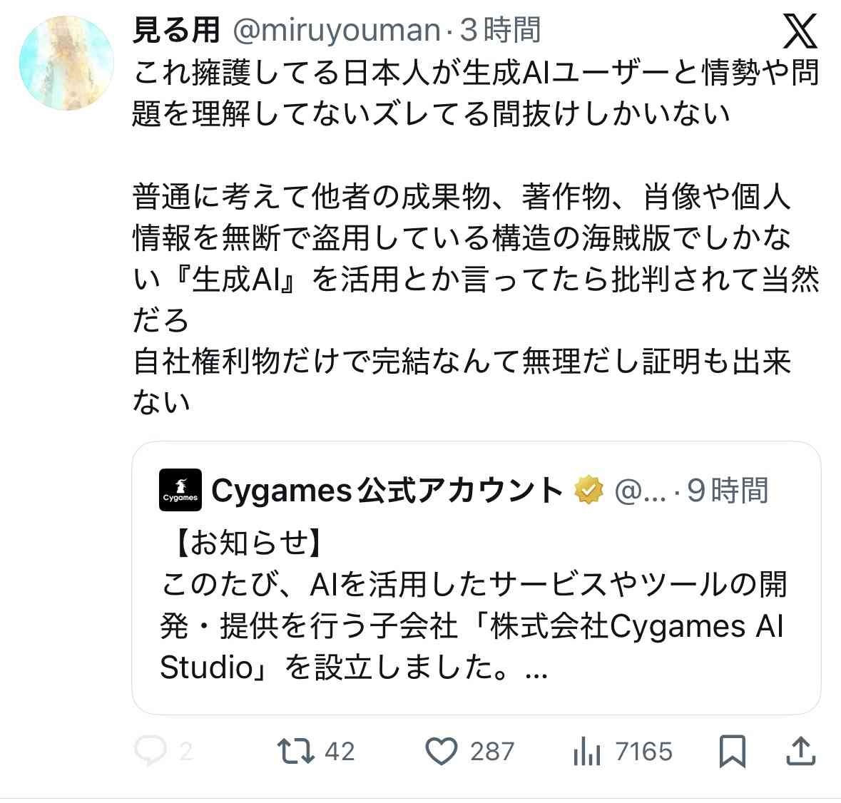 「反AIはウマ娘できないね(笑)」 と茶化すAI信者が居るが… 本当にウマ娘を去る海外ユーザーが少なからず居るのは見て分かるはず。 海外ユーザーは良い顔してない。 生成AIがAI Slop(AIゴミ)と呼ばれる今なら尚更。 「AI」と聞いて...
