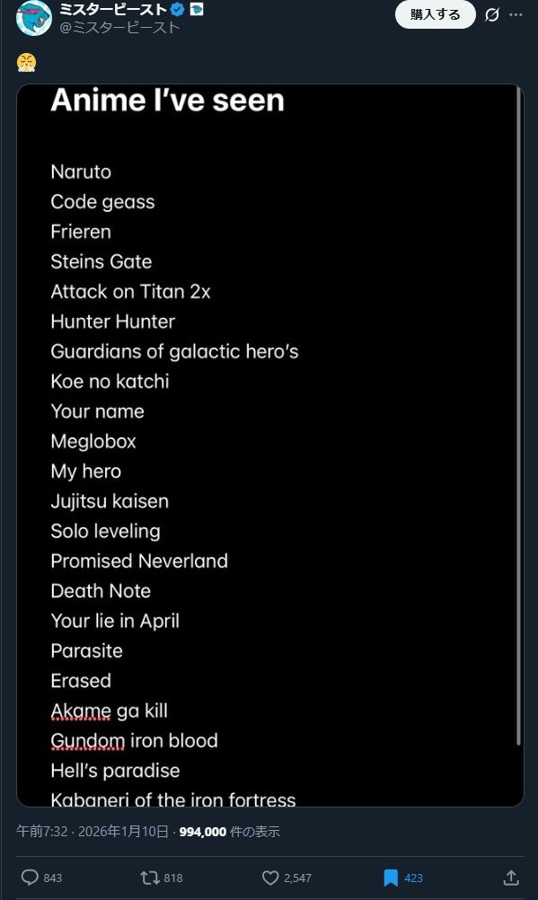 ミスタービーストも四月は君の嘘観て泣いてるんか