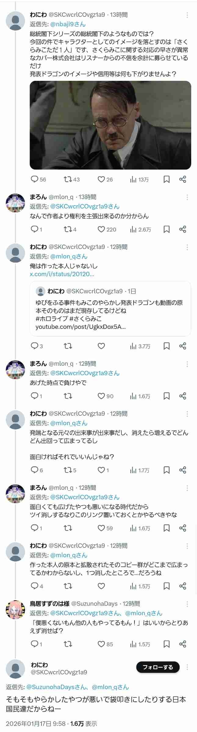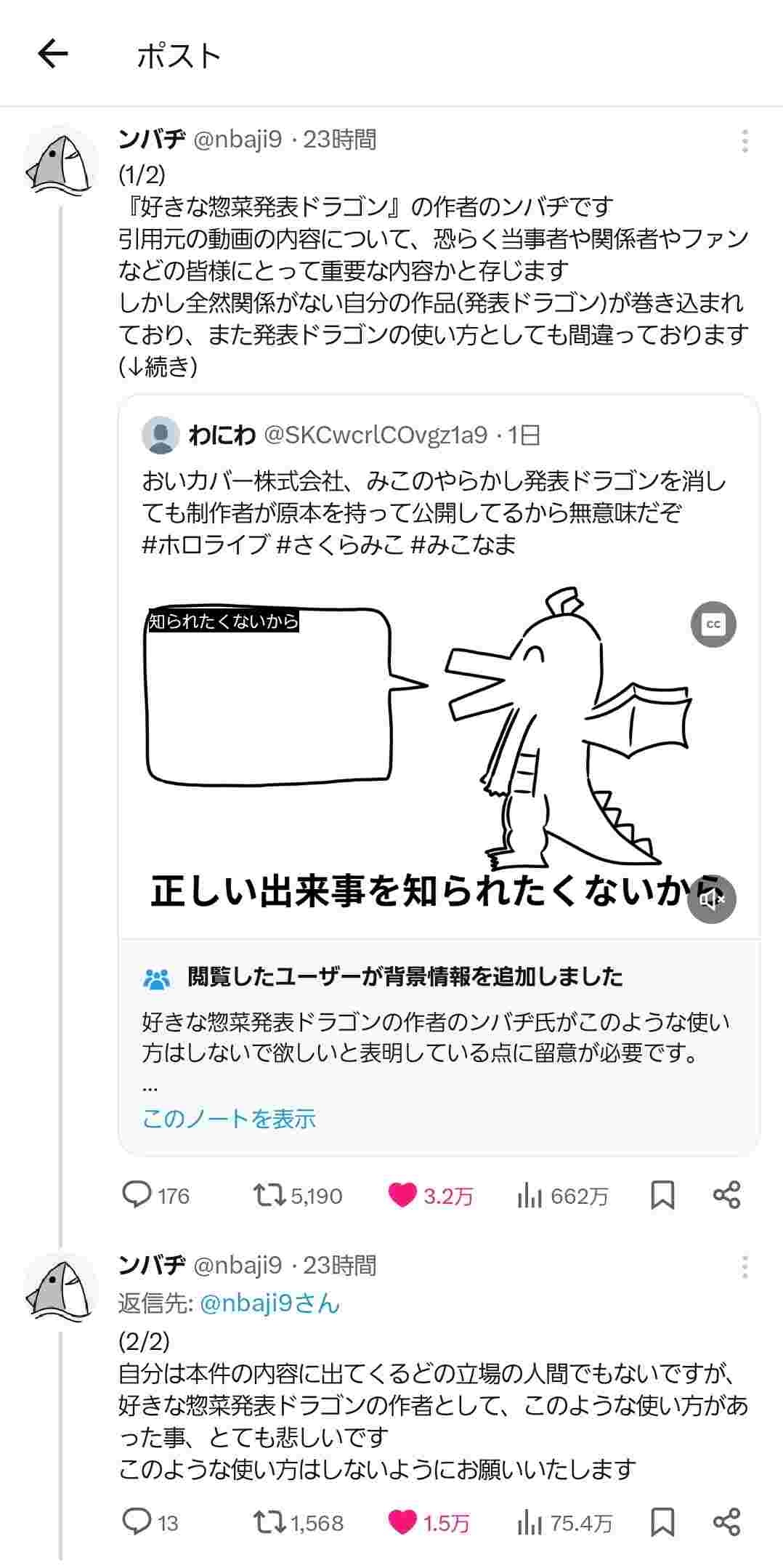 ⑤ホロライブが発表ドラゴン作者に圧力を掛けて動画を削除させている、という陰謀論まで出回り再度作者声明発表