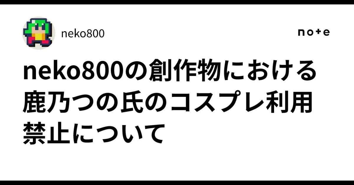 この度、昨今の情勢を鑑みた結果、neko800は、当方が制作・公開するすべての創作物(イラスト、文章、設定資料、キャラクター関連コンテンツ等を含む)に関し、鹿乃つの氏によるコスプレ表現の使用を禁止する方針を決定いたしましたので、お知らせいたします。